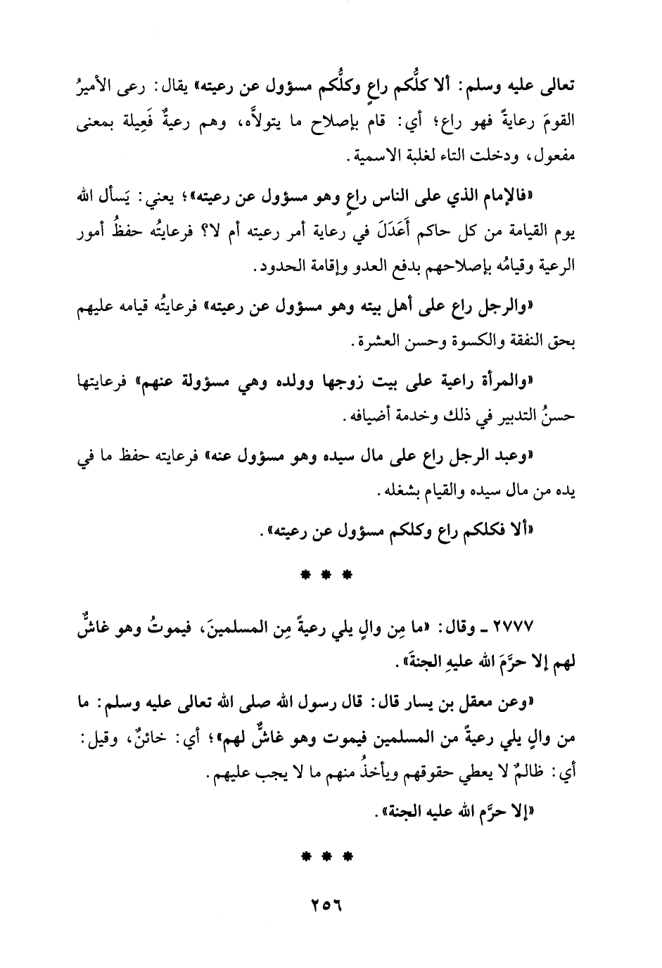"وعن معقل بن يسار قال: قال رسول الله صلى الله تعالى عليه وسلم: ما من والٍ يلي رعيةً من المسلمين فيموت وهو غاشٌّ لهم"؛ أي: خائنٌ، وقيل: أي: ظالمٌ لا يعطي حقوقهم ويأخذُ منهم ما لا يجب عليهم.