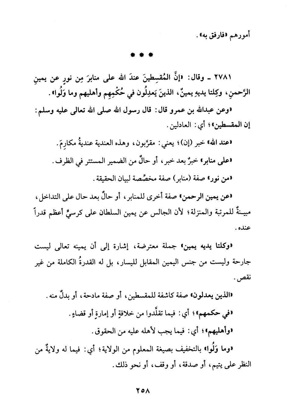 2781 - وقال: "إنَّ المُقسِطينَ عندَ الله على منابرَ مِن نورٍ عن يمينِ الرَّحمنِ، وكِلتا يديهِ يمينٌ، الذينَ يَعدِلُون في حُكْمِهِم وأهليهم وما وَلُوا".
