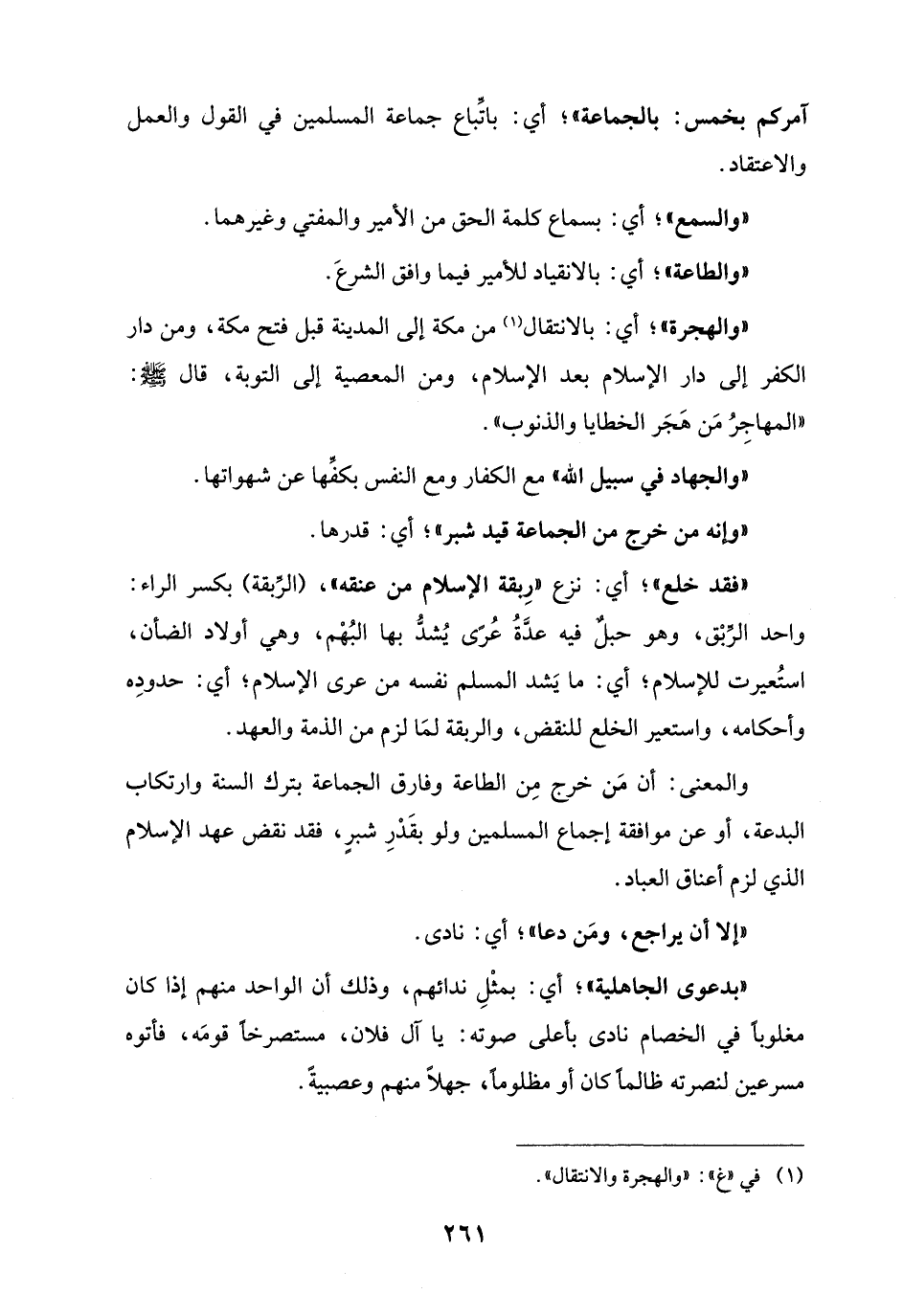 آمركم بخمس: بالجماعة"؛ أي: باتِّباع جماعة المسلمين في القول والعمل والاعتقاد.