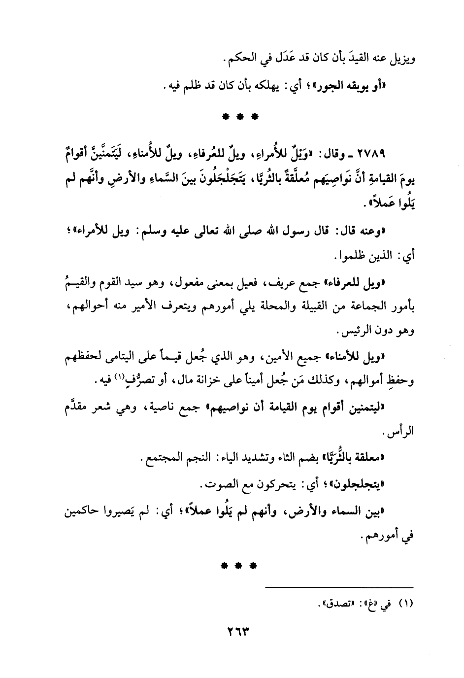 2789 - وقال: "وَيْلٌ للأُمراءِ, ويلٌ للعُرفاءِ, ويلٌ للأُمناءِ, لَيَتَمنَّينَّ أقوامٌ يومَ القيامةِ أن نَواصِيَهم مُعلَّقةٌ بالثُريَّا، يَتَجَلْجَلُونَ بينَ السَّماءِ والأرضِ وأنَّهم لم يَلُوا عَملاً".
