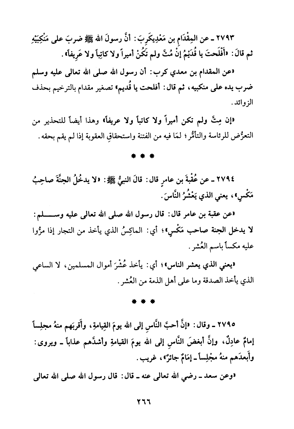 2793 - عن المِقْدَامِ بن مَعْدِيكَرِبَ: أن رسولَ الله - صلى الله عليه وسلم - ضربَ على مَنْكِبَيْهِ ثم قالَ: "أَفْلَحتَ يا قُدَيْمُ انْ مُتَّ ولم تَكُنْ أميراً ولا كاتِباً ولا عَرِيفاً".