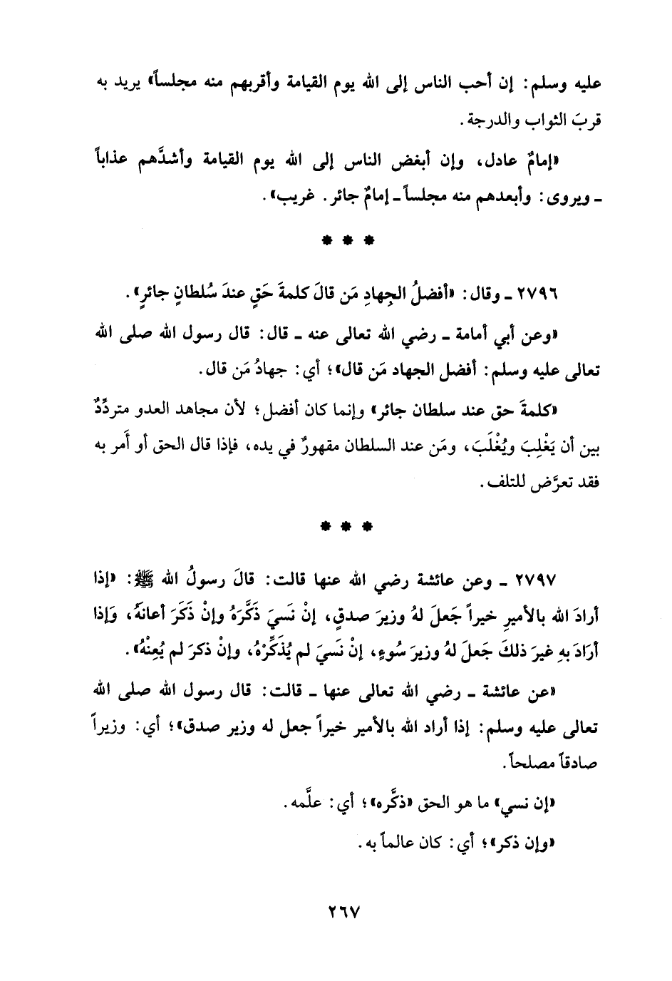 2796 - وقال: "أفضلُ الجهادِ مَن قالَ كلمةَ حَقٍ عندَ سُلطانٍ جائرٍ".