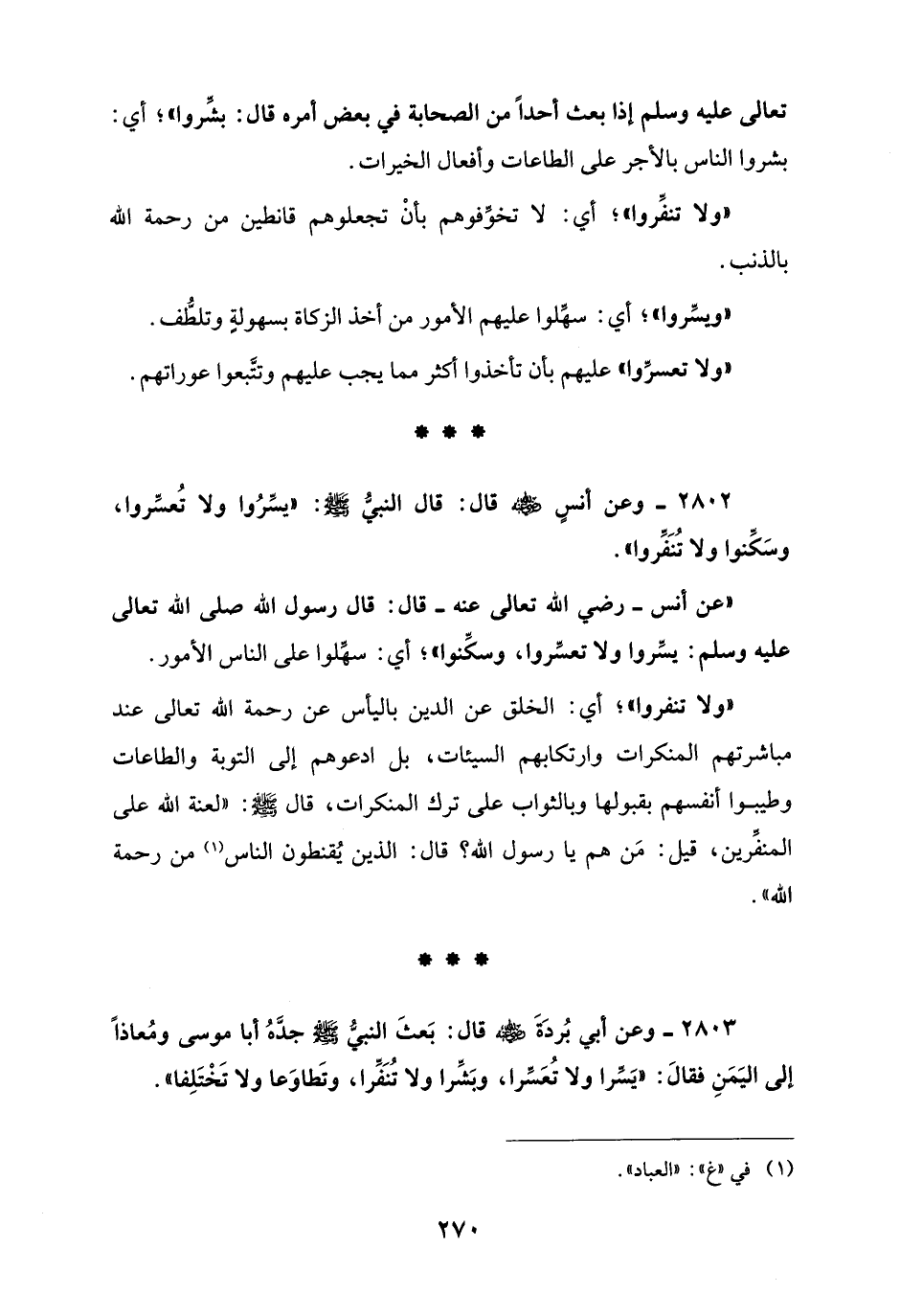 2802 - وعن أنسٍ - رضي الله عنه - قال: قال النبيُّ - صلى الله عليه وسلم -: "يسِّرُوا ولا تُعسِّروا، وسَكِّنوا ولا تُنَفِّروا".