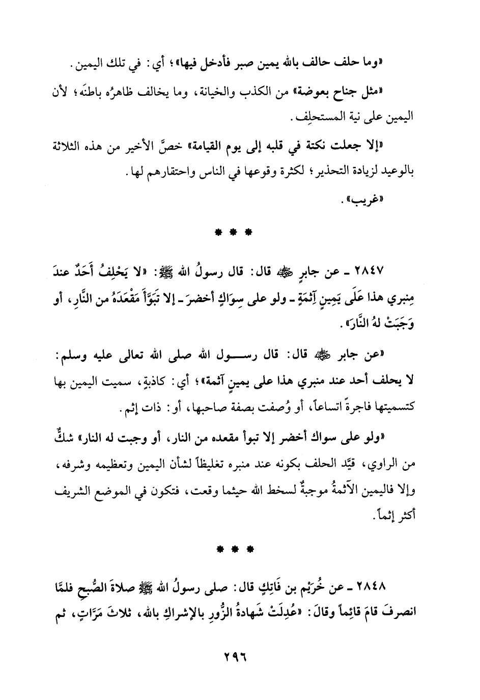 2847 - عن جابرٍ - رضي الله عنه - قال: قال رسولُ الله - صلى الله عليه وسلم -: "لا يَحْلِفُ أَحَدٌ عندَ مِنبري هذا عَلَى يَمِينٍ آِثمَةٍ - ولو على سِوَاكٍ أخضرَ - إلا تَبَوَّأَ مَقْعَدَهُ من النَّارِ، أو وَجَبَتْ لهُ النَّارَ".