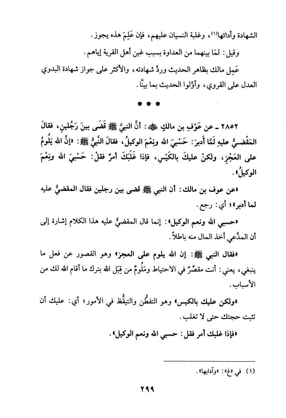 2852 - عن عَوْفِ بن مالكٍ - رضي الله عنه -: أن النبيَّ - صلى الله عليه وسلم - قَضَى بينَ رَجُلينِ، فقالَ المَقْضىُّ عليهِ لَمَّا أَدبرَ: حَسْبيَ الله ونِعْمَ الوكيلُ، فقالَ النَّبىُّ - صلى الله عليه وسلم -: "إن الله يَلُومُ على العَجْزِ، ولكنْ عليكَ بالكَيْسِ، فإذا غَلَبَكَ أمرٌ فقلْ: حَسْبيَ الله ونِعْمَ الوكيلُ".