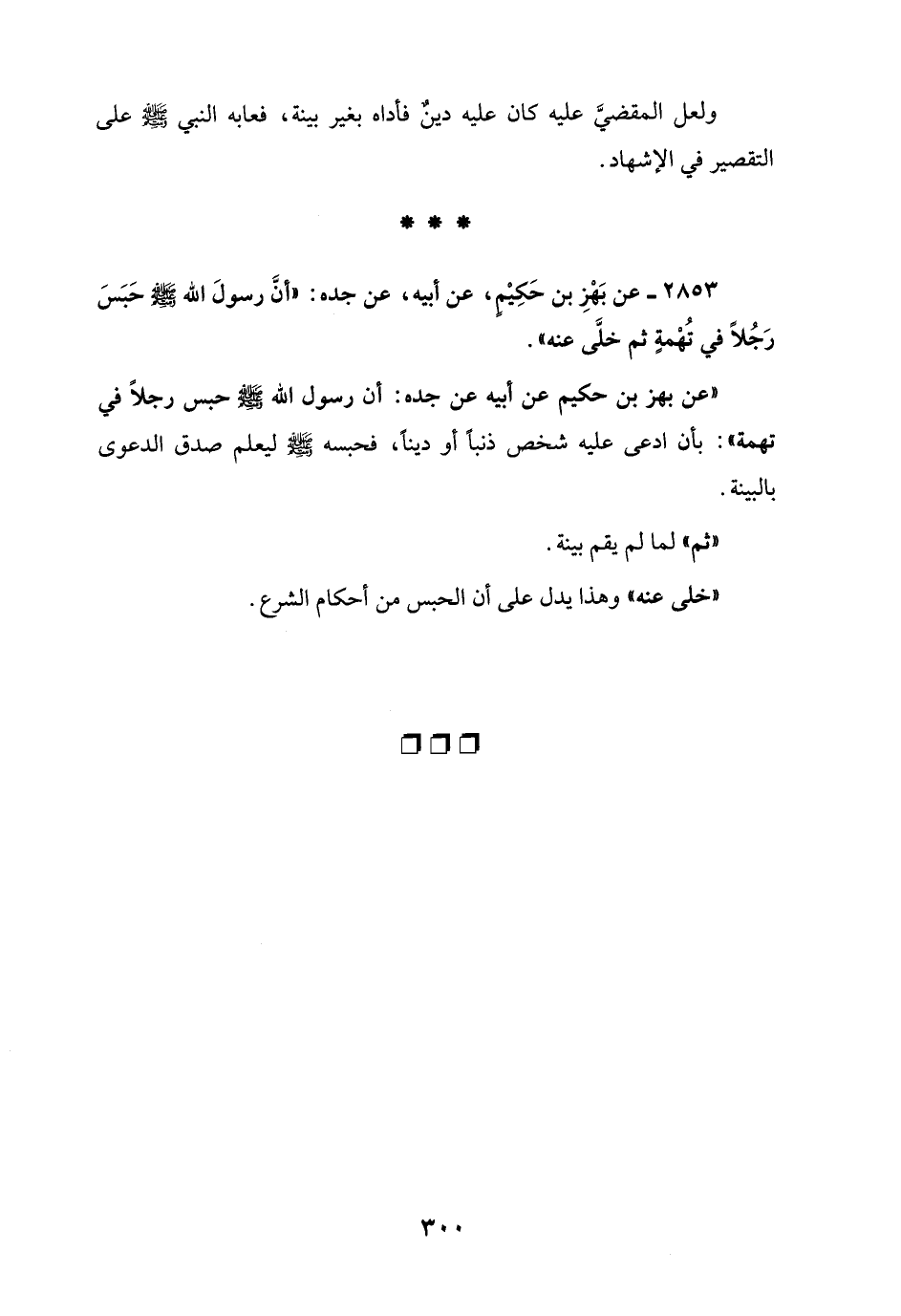2853 - عن بَهْزِ بن حَكِيْمٍ، عن أبيه، عن جده: "أنَّ رسولَ الله - صلى الله عليه وسلم - حَبَسَ رَجُلًا فَي تُهْمةٍ ثم خلَّى عنه".