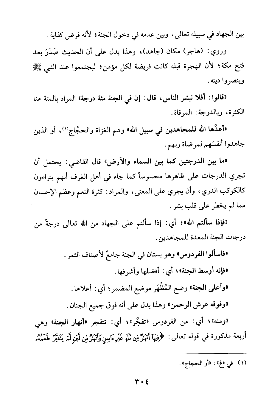 "ما بين الدرجتين كما بين السماء والأرض" قال القاضي: يحتمل أن تجري الدرجات على ظاهرها محسوسًا كما جاء في أهل الغرف أنهم يتراءون كالكوكب الدري، وأن يجري على المعنى، والمراد: كثرة النعم وعظم الإحسان مما لم يخطر على قلب بشر.