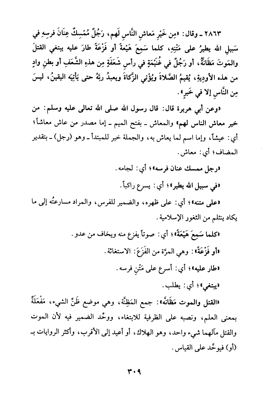 2863 - وقال: "مِن خَيْرِ مَعاشِ النَّاسِ لَهم، رَجُلٌ مُمْسِكٌ عِنَانَ فرسِهِ في سَبيلِ الله يطيرُ على مَتْنِهِ، كلما سَمعَ هَيْعةً أو فَزْعَةً طارَ عليه يبتغي القتلَ والمَوتَ مَظَانَّةٌ، أو رَجُل في غُنَيْمَةٍ في رأسِ شَعَفَةٍ مِن هذهِ الشَّعَفِ أو بطنِ وادٍ من هذه الأودِيةِ، يُقيمُ الصَّلاةَ ويُؤْتي الزَّكاةَ ويعبدُ ربَّهُ حتى يَأتِيَه اليقينُ، ليسَ مِن النَّاسِ إلا في خَيرٍ".