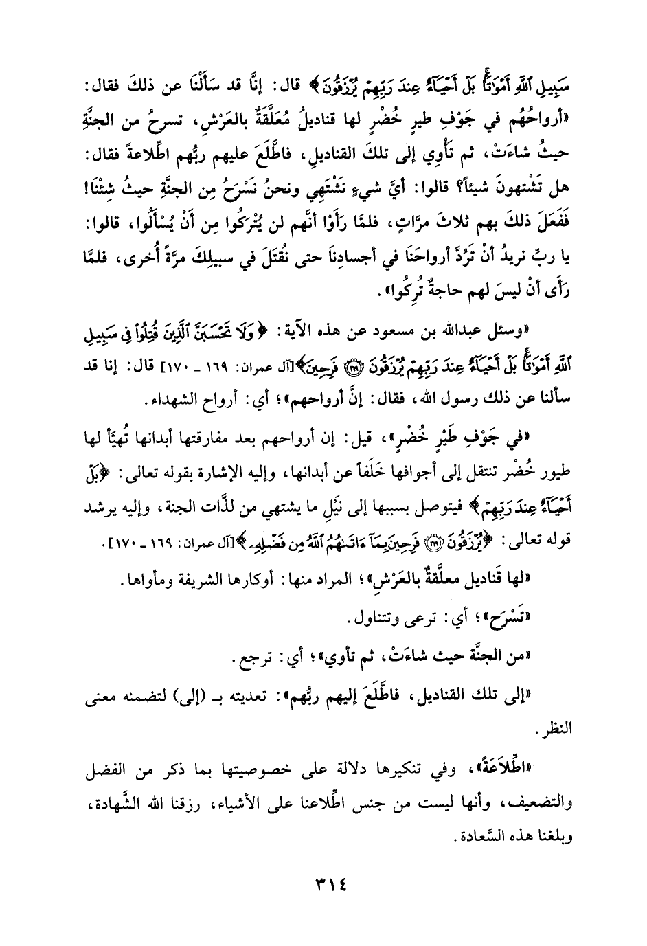 "وسئل عبد الله بن مسعود عن هذه الآية: {وَلَا تَحْسَبَنَّ الَّذِينَ قُتِلُوا فِي سَبِيلِ اللَّهِ أَمْوَاتًا بَلْ أَحْيَاءٌ عِنْدَ رَبِّهِمْ يُرْزَقُونَ (169) فَرِحِينَ} [آل عمران: 169، 170] قال: إنا قد سألنا عن ذلك رسول الله، فقال: إنَّ أرواحهم"؛ أي: أرواح الشهداء.