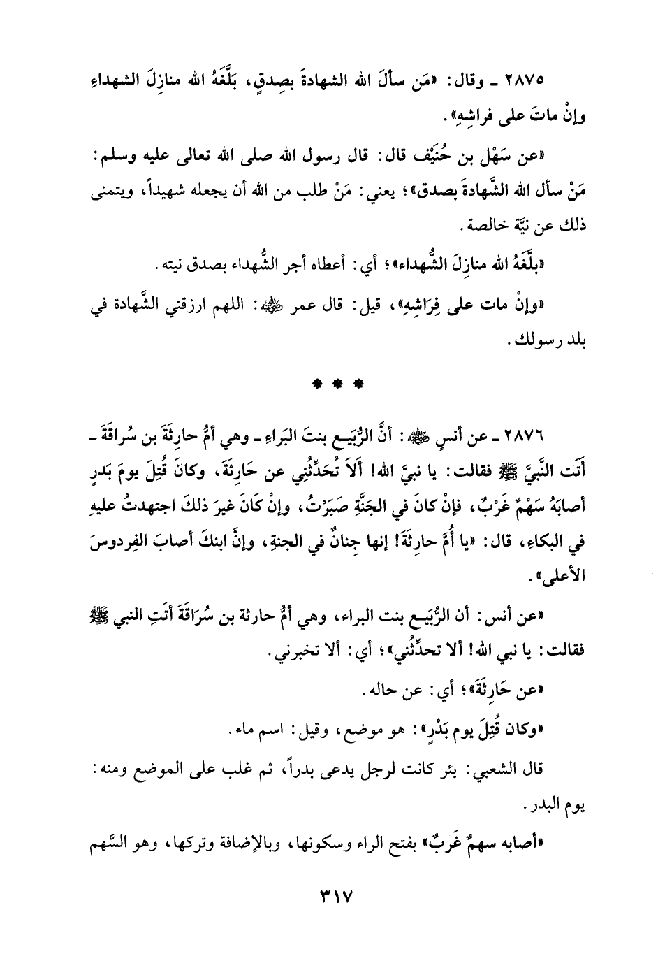 2876 - عن أنسٍ - رضي الله عنه -: أن الرُّبَيع بنتَ البَراءِ - وهي أمُّ حارِثَةَ بن سُراقَةَ - أَتَت النَّبيَّ - صلى الله عليه وسلم - فقالت: يا نبيَّ الله! أَلَا تُحَدِّثُنِي عن حَارِثَةَ، وكانَ قُتِلَ يومَ بَدرٍ أصابَهُ سَهْمٌ غَرْبٌ، فإنْ كانَ في الجَنَّةِ صَبَرْتُ، وإنْ كَانَ غيرَ ذلكَ اجتهدتُ عليهِ في البكاءِ قال: "يا أُمَّ حارِثَةَ! إنها جِنانٌ في الجنةِ، وإنَّ ابنكَ أصابَ الفِردوسَ الأعلى".