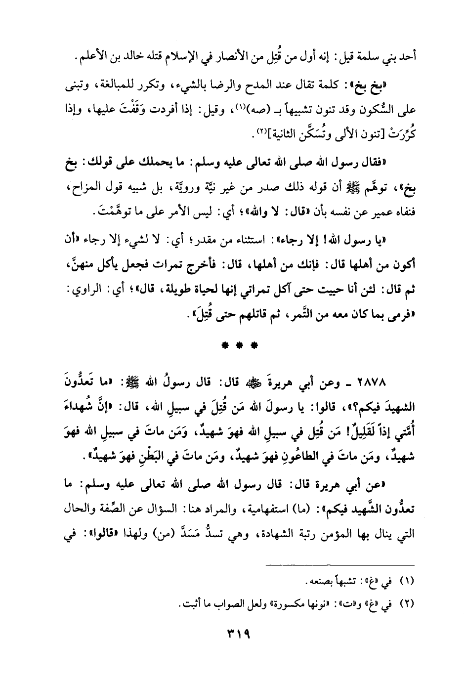 "عن أبي هريرة قال: قال رسول الله صلى الله تعالى عليه وسلم: ما تعدُّون الشَّهيد فيكم": (ما) استفهامية، والمراد هنا: السؤال عن الصِّفة والحال التي ينال بها المؤمن رتبة الشهادة، وهي تسدُّ مَسَدَّ (من) ولهذا "قالوا": في