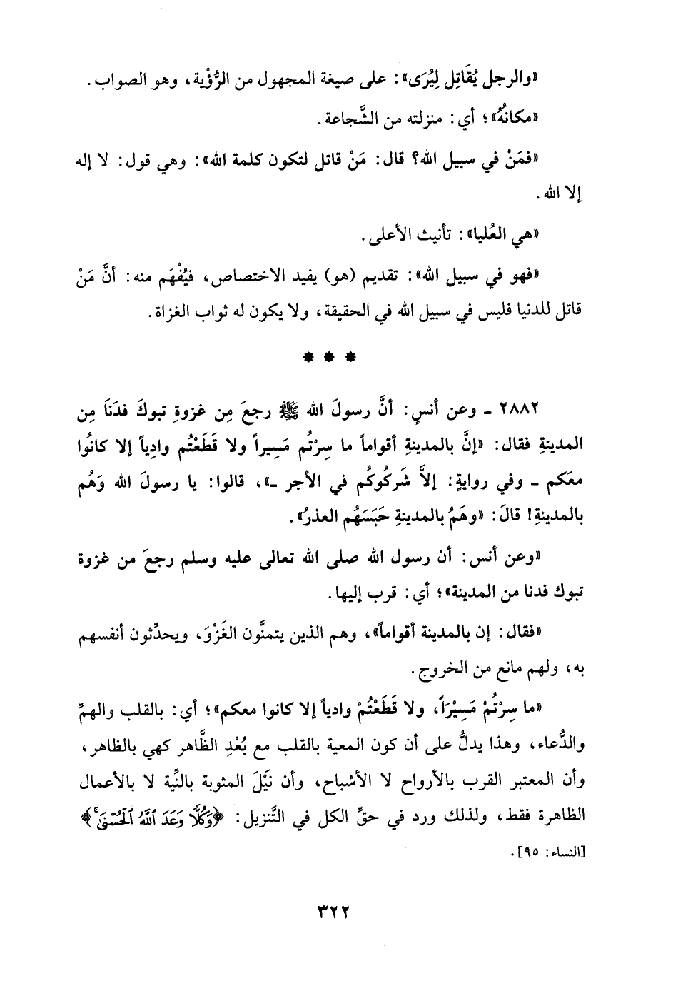 "ما سِرْتُمْ مَسِيْرًا، ولا قَطَعْتُمْ واديًا إلا كانوا معكم"؛ أي: بالقلب والهمِّ والدُّعاء، وهذا يدلُّ على أن كون المعية بالقلب مع بُعْدِ الظَّاهر كهي بالظاهر، وأن المعتبر القرب بالأرواح لا الأشباح، وأن نَيْلَ المثوبة بالنِّية لا بالأعمال الظاهرة فقط، ولذلك ورد في حق الكل في التَّنزيل: {وَكُلًّا وَعَدَ اللَّهُ الْحُسْنَى} [النساء: 95].