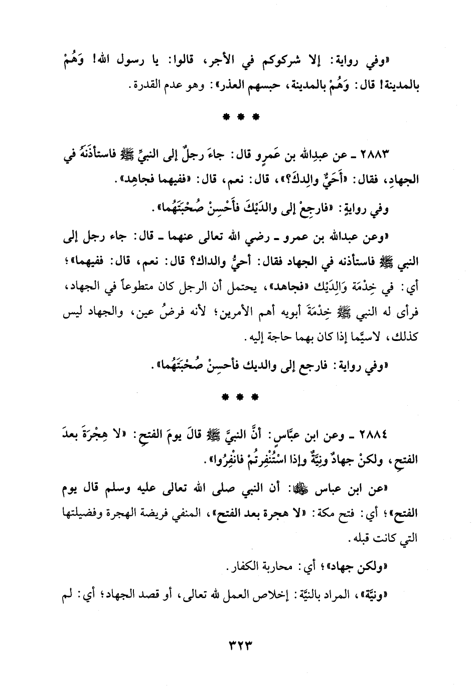 2883 - عن عبدِ الله بن عَمرٍو قال: جاءَ رجلٌ إلى النبيِّ - صلى الله عليه وسلم - فاستأذَنَهُ في الجهادِ، فقال: "أَحَيٌّ والِدكَ؟ "، قال: نعم، قال: "ففيهما فجاهِد".