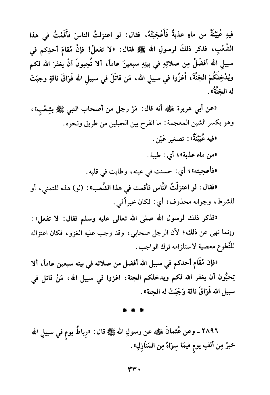 فيهِ عُيَيْنَةٌ من ماءٍ عذبةٌ فَأَعْجَبَتْهُ، فقال: لو اعتزلتُ الناسَ فأَقَمْتُ في هذا الشِّعْبِ، فذكر ذلكَ لرسولِ الله - صلى الله عليه وسلم - فقال: "لا تفعلْ! فإنَّ مُقامَ أحدِكم في سبيلِ الله أفضَلُ مِن صلاتِهِ في بيتِهِ سبعينَ عاماً، ألا تُحِبونَ أنْ يغفرَ الله لكم ويُدْخِلَكُمْ الجَنَّةَ، اُغزُوا في سبيلِ الله، مَن قاتَلَ في سبيلِ الله فَوَاقَ ناقةٍ وجبَتْ له الجَنَّةُ".