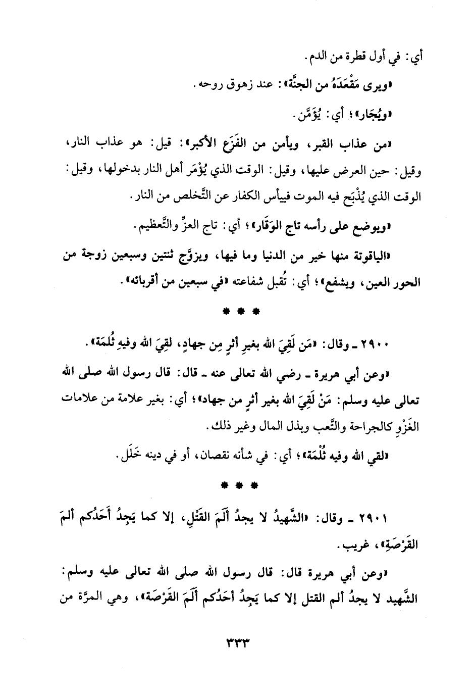 "وعن أبي هريرة قال: قال رسول الله صلى الله تعالى عليه وسلم: الشَّهيد لا يجدُ ألم القتل إلا كما يَجدُ أحَدُكم ألمَ القَرْصَة"، وهي المرَّة من
