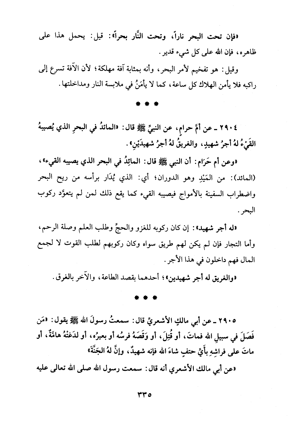 2904 - عن أمَّ حرامٍ، عن النبيِّ - صلى الله عليه وسلم - قال: "المائدُ في البحرِ الذي يُصيبهُ القَيْءُ لهُ أجرُ شهيدٍ، والغريقُ لهُ أجرُ شهيدَيْنِ".