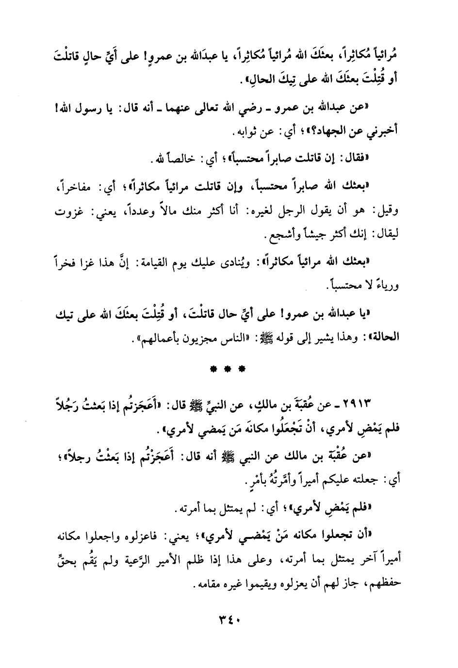 مُرائياً مُكاثِراً، بعثَكَ الله مُرائياً مُكاثِراً، يا عبدَ الله بن عمروٍ! على أَيِّ حالٍ قاتلْتَ أو قُتِلْتَ بعثَكَ الله على تِيكَ الحالِ".