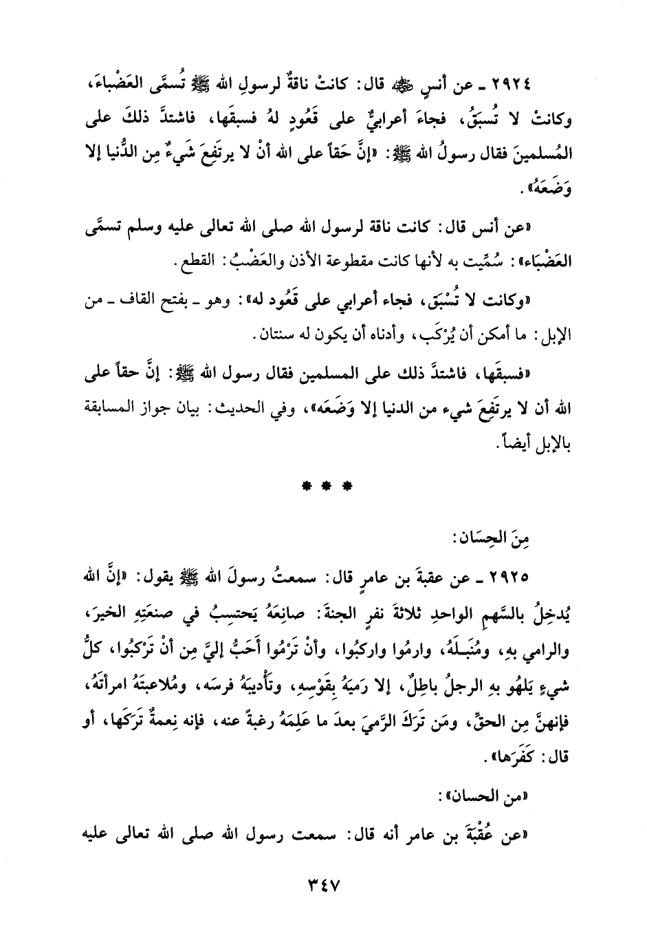 "فسبقَها، فاشتدَّ ذلك على المسلمين فقال رسول الله - صلى الله عليه وسلم -: إنَّ حقاً على الله أن لا يرتَفِعَ شيء من الدنيا إلا وَضَعَه"، وفي الحديث: بيان جواز المسابقة بالإبل أيضاً.