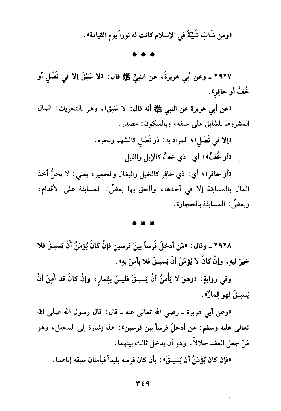 2927 - وعن أبي هريرةَ، عن النبيِّ - صلى الله عليه وسلم - قال: "لا سَبْقَ إلا في نَصْلٍ أو خُفٍّ أو حافِرٍ".