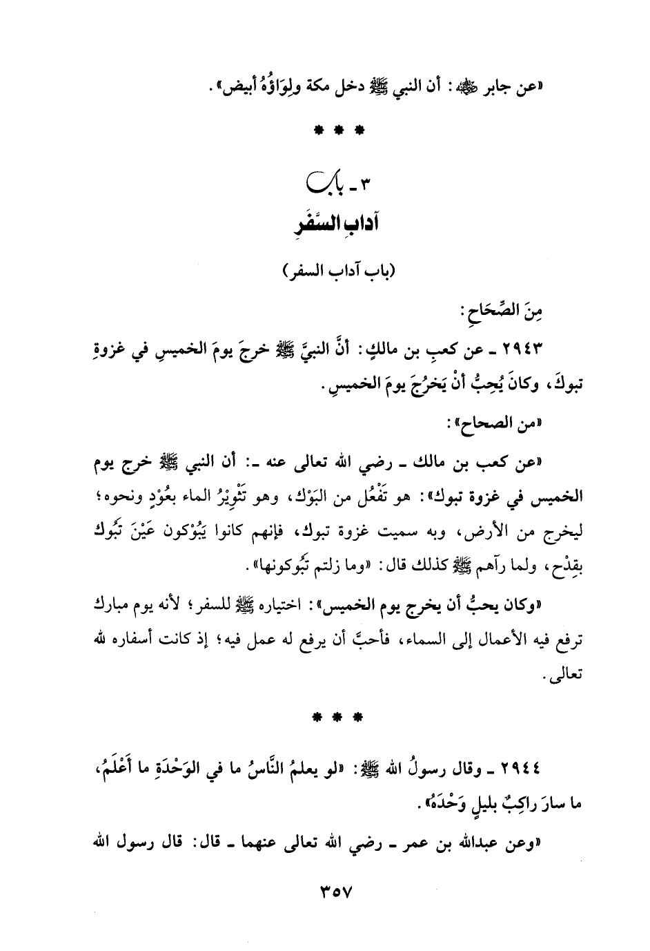 2943 - عن كعبِ بن مالكٍ: أن النبيَّ - صلى الله عليه وسلم - خرجَ يومَ الخميسِ في غزوةِ تبوكَ، وكانَ بُحِبُّ أنْ يَخرُجَ يومَ الخميسِ.