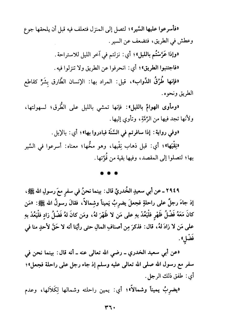 2949 - عن أبي سعيدٍ الخُدريِّ قال: بينما نحنُ في سفرٍ معَ رسولِ الله - صلى الله عليه وسلم -، إذ جاءَ رجلٌ على راحلةٍ فجعلَ يضرِبُ يَميناً وشِمالاً، فقالَ رسولُ الله - صلى الله عليه وسلم -: "مَن كانَ مَعَهُ فَضْلُ ظَهْرٍ فلْيَعُدْ بهِ على مَن لا ظَهْرَ لهُ، ومَن كانَ لهُ فَضْلُ زاد فلْيَعُدْ بهِ على مَن لا زادَ لهُ، قال: فذكرَ مِن أصنافِ المالِ حتى رأيْتا أنه لا حَقَّ لأحدٍ منا في فَضْلٍ".