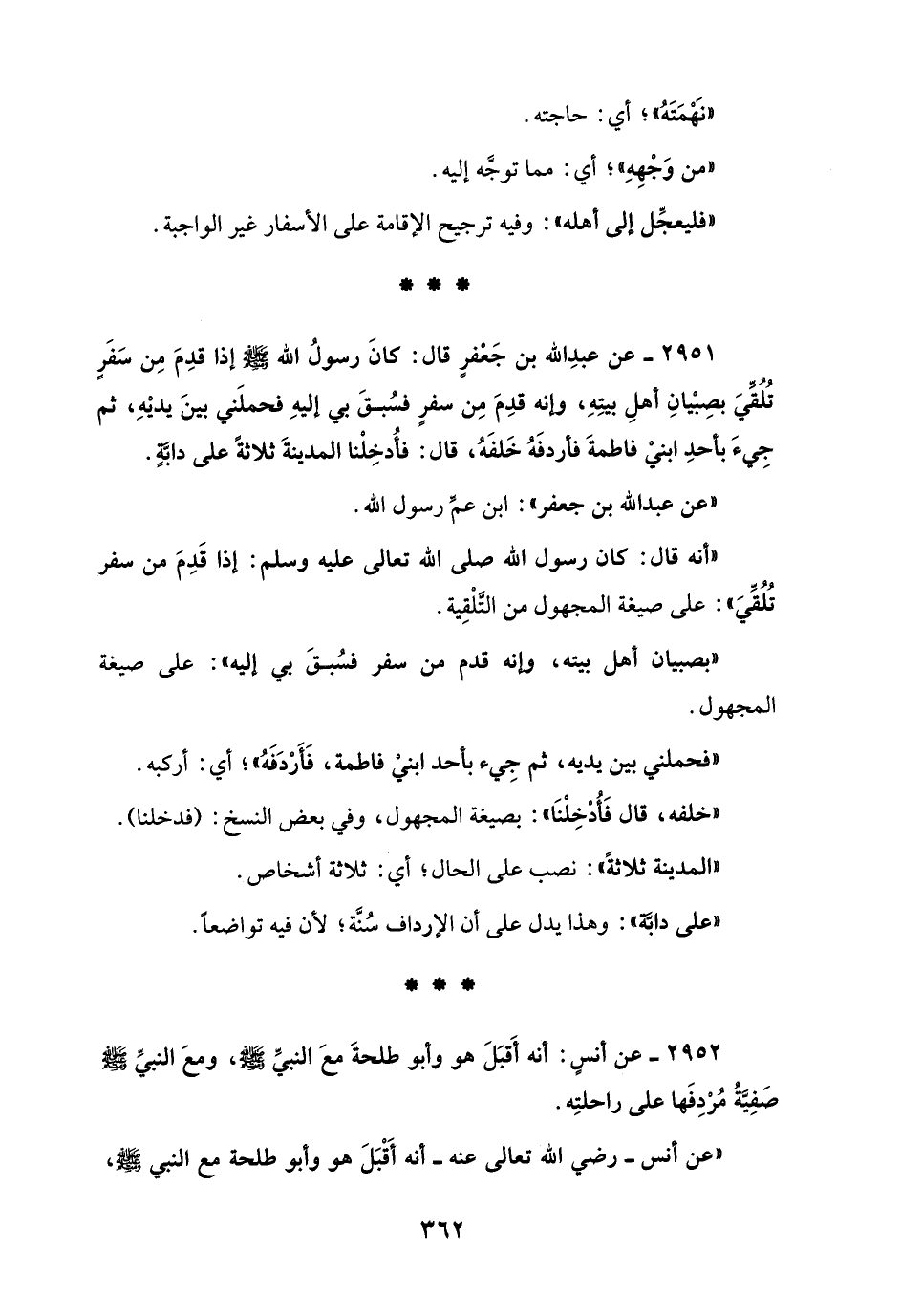 2951 - عن عبدِ الله بن جَعْفرٍ قال: كانَ رسولُ الله - صلى الله عليه وسلم - إذا قدِمَ مِن سَفَرٍ تُلُقِّيَ بصِبْيانِ أهلِ بيتِهِ، وإنه قدِمَ مِن سفرٍ فسُبقَ بي إليهِ فحملَني بينَ يديْهِ، ثم جِيءَ بأحدِ ابنيْ فاطمةَ فأردفَهُ خَلفَهُ، قال: فأُدخِلْنا المدينةَ ثلاثةً على دابَّةٍ.
