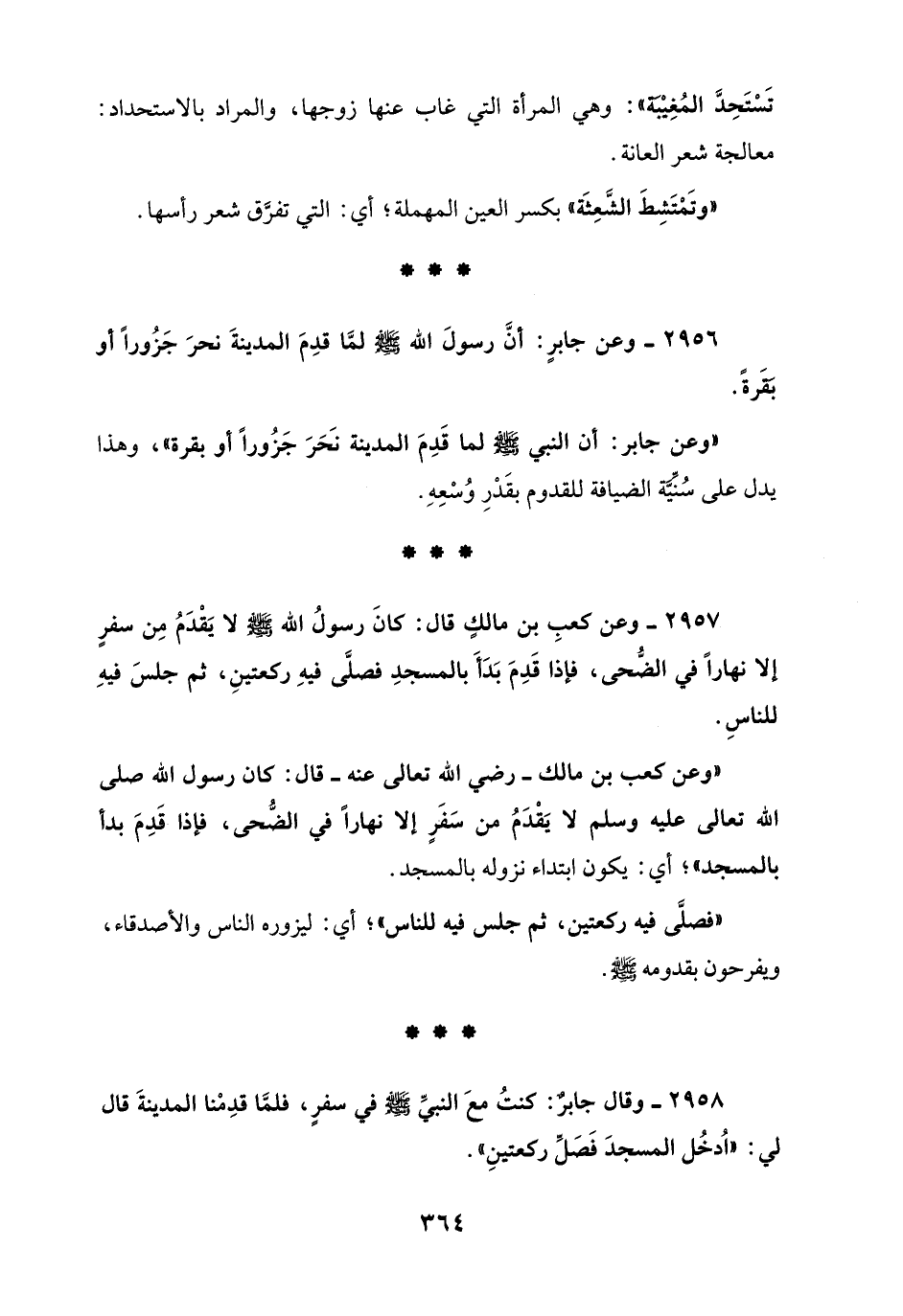 2957 - وعن كعبِ بن مالكٍ قال: كانَ رسولُ الله - صلى الله عليه وسلم - لا يَقْدَمُ مِن سفرٍ إلا نهاراً في الضُّحى، فإذا قَدِمَ بَدَأَ بالمسجدِ فصلَّى فيهِ ركعتينِ، ثم جلسَ فيهِ للناسِ.