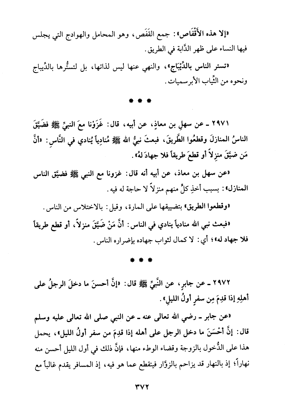 2971 - عن سهلِ بن معاذٍ، عن أبيه، قال: غَزَوْنا معَ النبيِّ - صلى الله عليه وسلم - فضَيَّقَ الناسُ المنازلَ وقطعُوا الطَّريقَ، فبعثَ نبيُّ الله - صلى الله عليه وسلم - مُنادِياً يُنادي في النَّاسِ: "أن مَن ضيَّقَ منزِلاً أو قطعَ طريقاً فلا جهادَ لهُ".