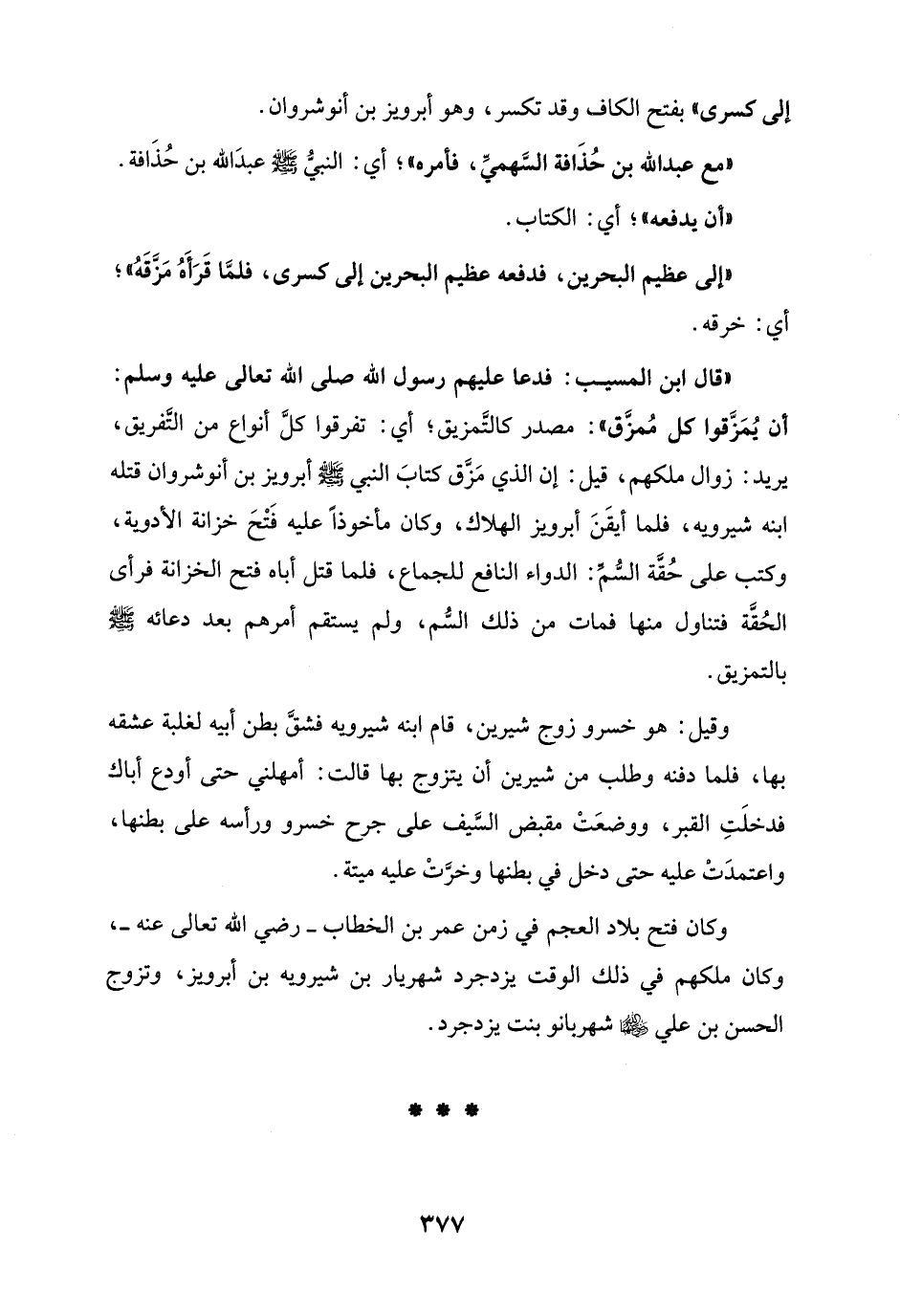 "قال ابن المسيب: فدعا عليهم رسول الله صلى الله تعالى عليه وسلم: أن يُمَزَّقوا كل مُمزَّق": مصدر كالتَّمزيق؛ أي: تفرقوا كلَّ أنواع من التفريق، يريد: زوال ملكهم، قيل: إن الذي مَزَّق كتابَ النبي - صلى الله عليه وسلم - أبرويز بن أنوشروان قتله ابنه شيرويه، فلما أيقَنَ أبرويز الهلاك، وكان مأخوذاً عليه فَتْحَ خزانة الأدوية، وكتب على حُقَّة السُّمِّ: الدواء النافع للجماع، فلما قتل أباه فتح الخزانة فرأى الحُقَّة فتناول منها فمات من ذلك السُّم، ولم يستقم أمرهم بعد دعائه - صلى الله عليه وسلم - بالتمزيق.