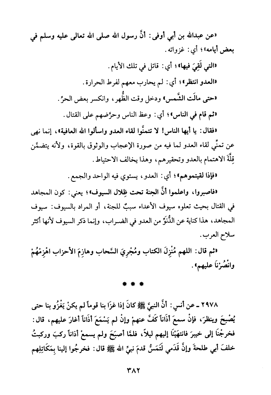 2978 - عن أنسٍ: أن النبيَّ - صلى الله عليه وسلم - كانَ إذا غزَا بنا قوماً لم يكنْ يَغْزُو بنا حتى يُصْبحَ وينظرَ، فإنْ سمعَ أذَاناً كَفَّ عنهمْ وإنْ لم يَسْمَعَ أذَاناً أغارَ عليهم، قال: فخرجْنَا إلى خيبرَ فانتهَيْنَا إليهم ليلاً، فلمَّا أصبَحَ ولم يسمعْ أذاناً ركبَ وركبتُ خلفَ أبي طلحةَ وإنَّ قَدَمي لَتَمَسُّ قدمَ نبيِّ الله - صلى الله عليه وسلم - قال: فخرجُوا إلينا بِمَكَاتِلِهم