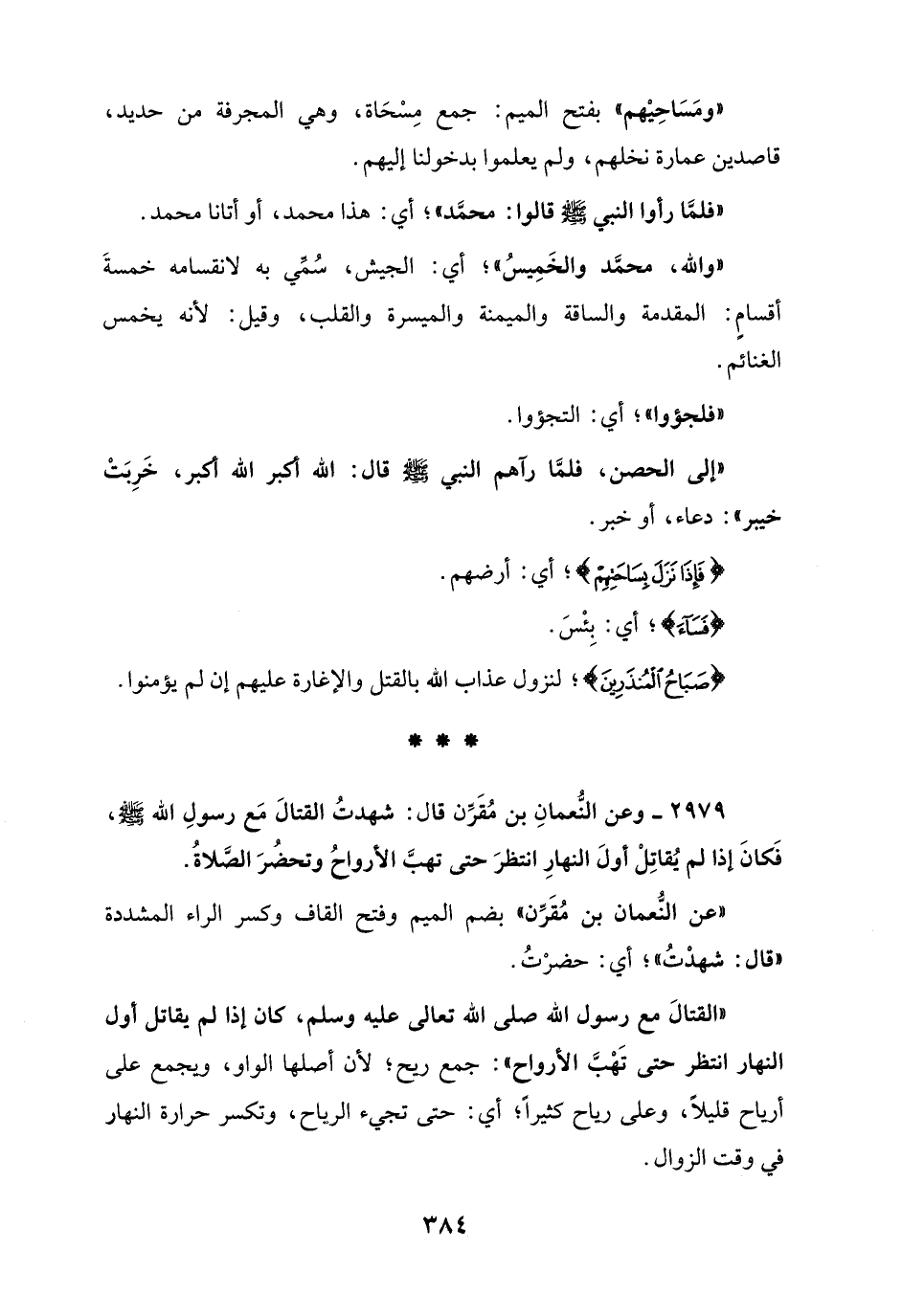 2979 - وعن النُّعمانِ بن مُقَرِّن قال: شهدتُ القتالَ مَع رسولِ الله - صلى الله عليه وسلم -، فَكانَ إذا لم يُقاتِلْ أولَ النهارِ انتظرَ حتى تهبَّ الأرواحُ وتحضُرَ الصَّلاةُ.