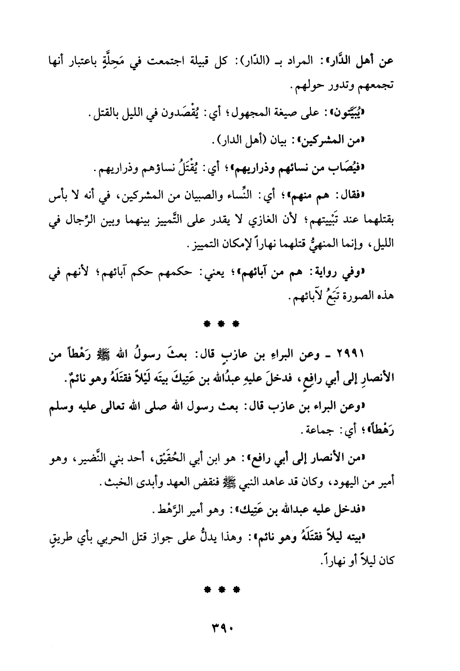 2991 - وعن البراءِ بن عازبٍ قال: بعثَ رسولُ الله - صلى الله عليه وسلم - رَهْطاً من الأنصارِ إلى أبي رافِعٍ، فدخلَ عليهِ عبدُ الله بن عَتِيكَ بيتَه لَيْلاً فقتَلَهُ وهو نائمٌ.