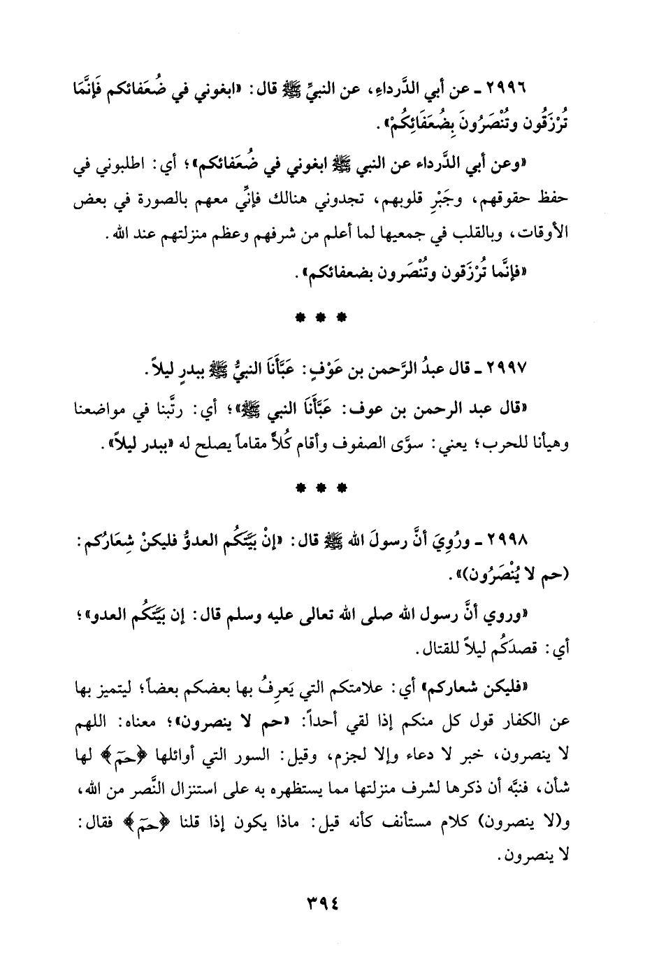 2996 - عن أبي الدَّرداءَ، عن النبيِّ - صلى الله عليه وسلم - قال: "ابغوني في ضُعَفائكم فَإنَّمَا تُرْزَقُون وتُنْصَرُونَ بِضُعَفَائِكُمْ".
