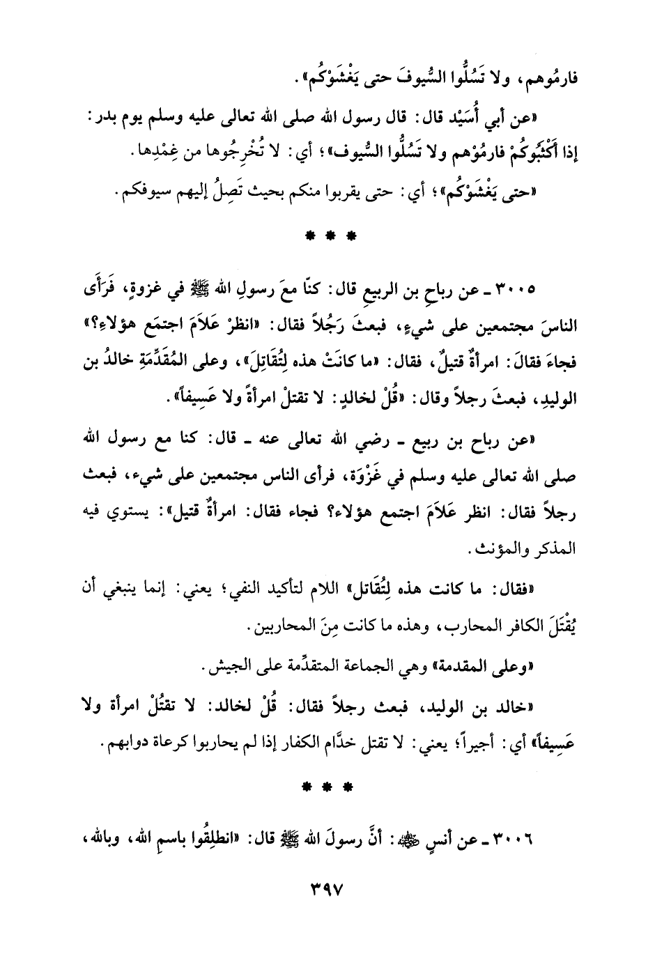 3005 - عن رباحِ بن الربيعِ قال: كنّا معَ رسولِ الله - صلى الله عليه وسلم - في غزوةٍ، فَرَأَى الناسَ مجتمعين على شيءٍ, فبعثَ رَجُلاً فقال: "انظرْ عَلاَمَ اجتمَع هؤلاءَ؟ " فجاءَ فقالَ: امرأةٌ قتيلٌ، فقال: "ما كانَتْ هذه لِتُقَاتِلَ"، وعلى المُقَدِّمَةِ خالدُ بن الوليدِ، فبعثَ رجلاً وقال: "قُلْ لخالدٍ: لا تقتلْ امرأةً ولا عَسِيفاً".
