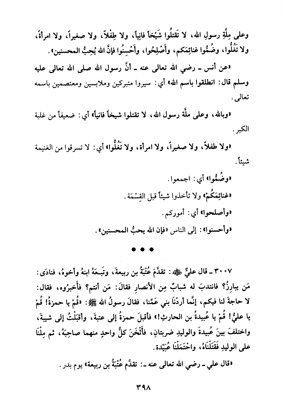 وعلى مِلَّةِ رسولِ الله، لا تَقتلُوا شَيْخاً فانِياً، ولا طِفْلاً، ولا صغيراً، ولا امرأةً، ولا تَغُلُّوا، وضُمُّوا غنائِمَكم، وأَصْلِحُوا، وأَحْسِنُوا فإنَّ الله يُحِبُّ المحسنين".