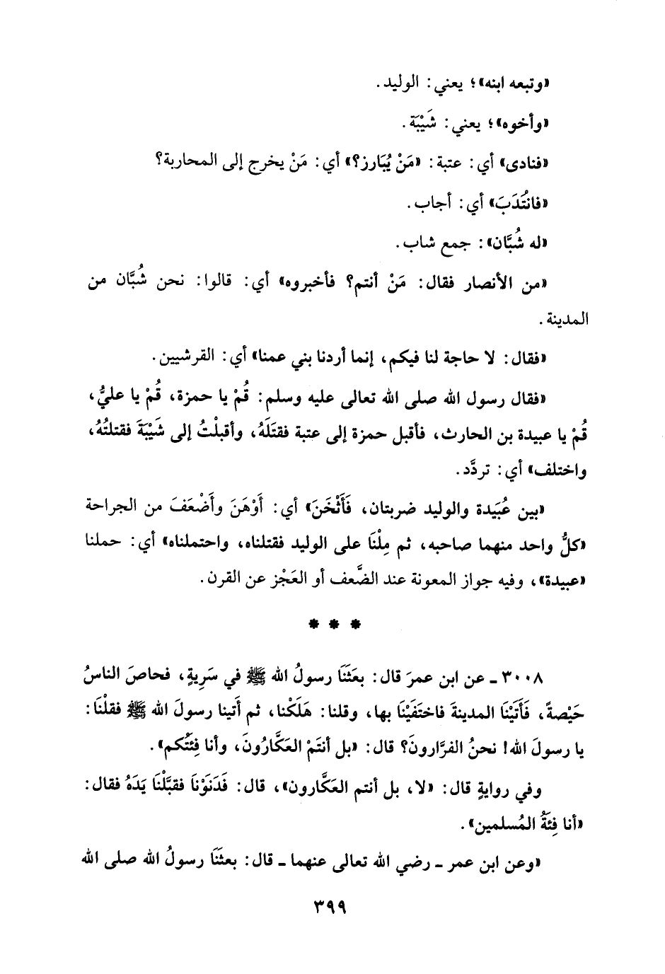 3008 - عن ابن عمرَ قال: بعَثَنَا رسولُ الله - صلى الله عليه وسلم - في سَرِيةٍ، فحاصَ الناسُ حَيْصةً، فَأَتَيْنَا المدينةَ فاختَفَيْنَا بها، وقلنا: هَلَكْنا، ثم أَتينا رسولَ الله - صلى الله عليه وسلم - فقلْنَا: يا رسولَ الله! نحنُ الفرَّارونَ؟ قال: "بل أنتَمْ العَكَّارُونَ، وأنا فِئَتُكم".