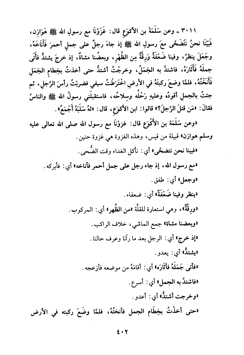3011 - وعن سَلَمَةَ بن الأكوَعِ قال: غَزَوْنَا مع رسولِ الله - صلى الله عليه وسلم - هَوَازِن، فَبَيْنَا نحنُ نتَضَحَّى معَ رسولِ الله - صلى الله عليه وسلم - إذ جاءَ رجلٌ على جملٍ أحمرَ فَأَنَاخَهُ، وجَعَلَ ينظرُ، وفينا ضَعْفَةٌ وَرِقَّةٌ مِن الظَّهْرِ، وبعضُنا مشاةٌ، إذ خرجَ يشتدُّ فأَتَى جملَهُ فَأَثَارَهُ، فاشتدَّ به الجَمَلُ، وخرجْتُ أشتدُّ حتى أخذتُ بخِطامِ الجَمَلِ فَأَنَخْتُهُ، فلمَّا وضعَ ركبتَهُ في الأرضِ اخْتَرَطْتُ سيفي فضربْتُ رأسَ الرَّجلِ، ثم جئتُ بالجملِ أقودُه وعليهِ رَحْلُه وسِلاحُه، فاستقبلَني رسولُ الله - صلى الله عليه وسلم - والناسُ فقالَ: "مَن قتلَ الرَّجلَ؟ " قالوا: ابن الأكوَعِ، قال: "لهُ سَلَبَهُ أَجْمَعُ".