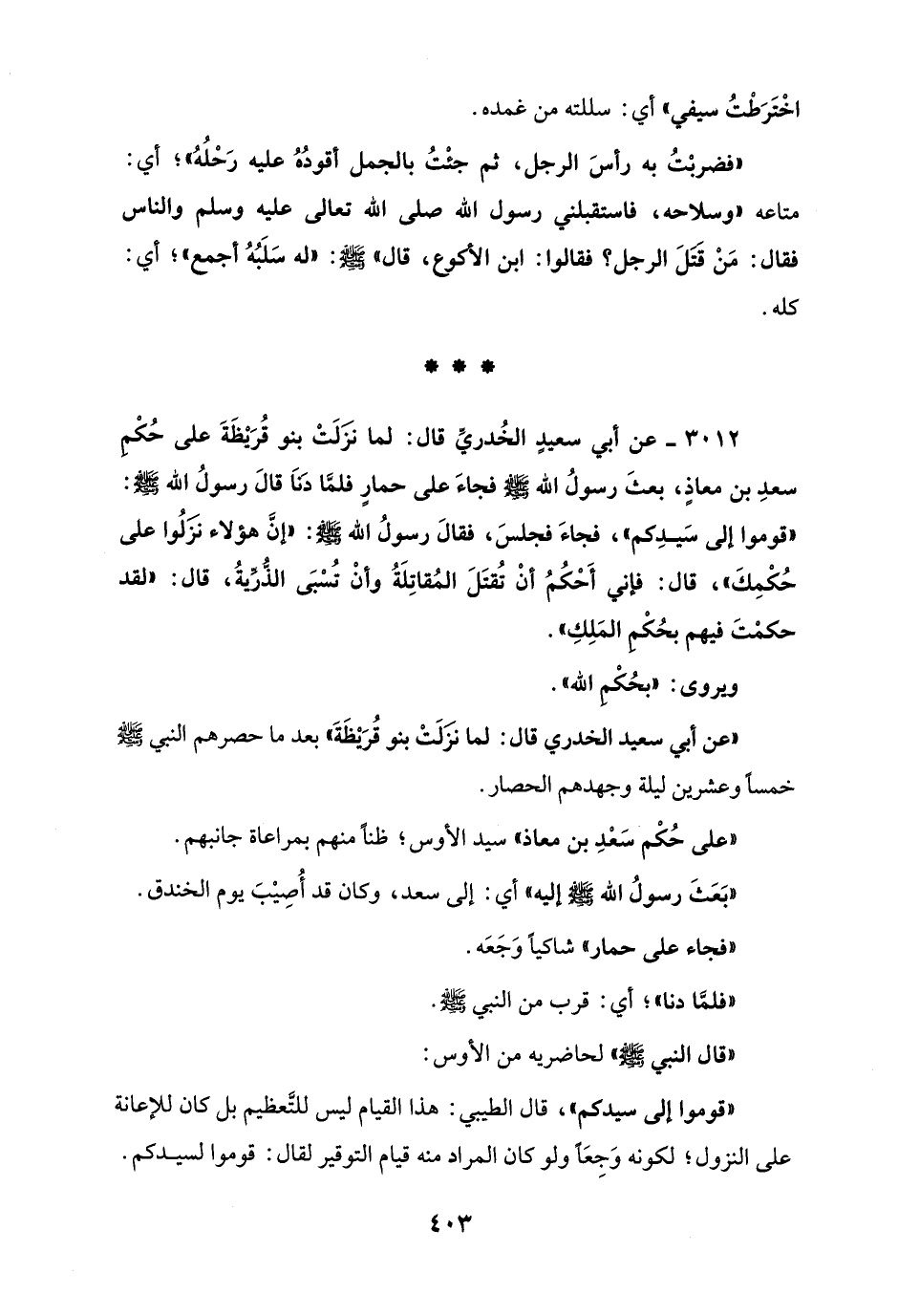 3012 - عن أبي سعيدٍ الخُدريِّ قال: لما نزَلَتْ بنو قُرَيْظَةَ على حُكْمِ سعدِ بن معاذٍ، بعثَ رسولُ الله - صلى الله عليه وسلم - فجاءَ على حمارٍ فلمَّا دَنَا قالَ رسولُ الله - صلى الله عليه وسلم -: "قوموا إلى سَيدِكم"، فجاءَ فجلسَ، فقالَ رسولُ الله - صلى الله عليه وسلم -: "إنَّ هؤلاء نزَلُوا على حُكْمِكَ"، قال: فإني أَحْكُمُ أنْ تُقتَلَ المُقاتِلَةُ وأنْ تُسْبَى الذُّرِّيةُ، قال: "لقد حكمْتَ فيهم بحُكْمِ المَلِكِ".