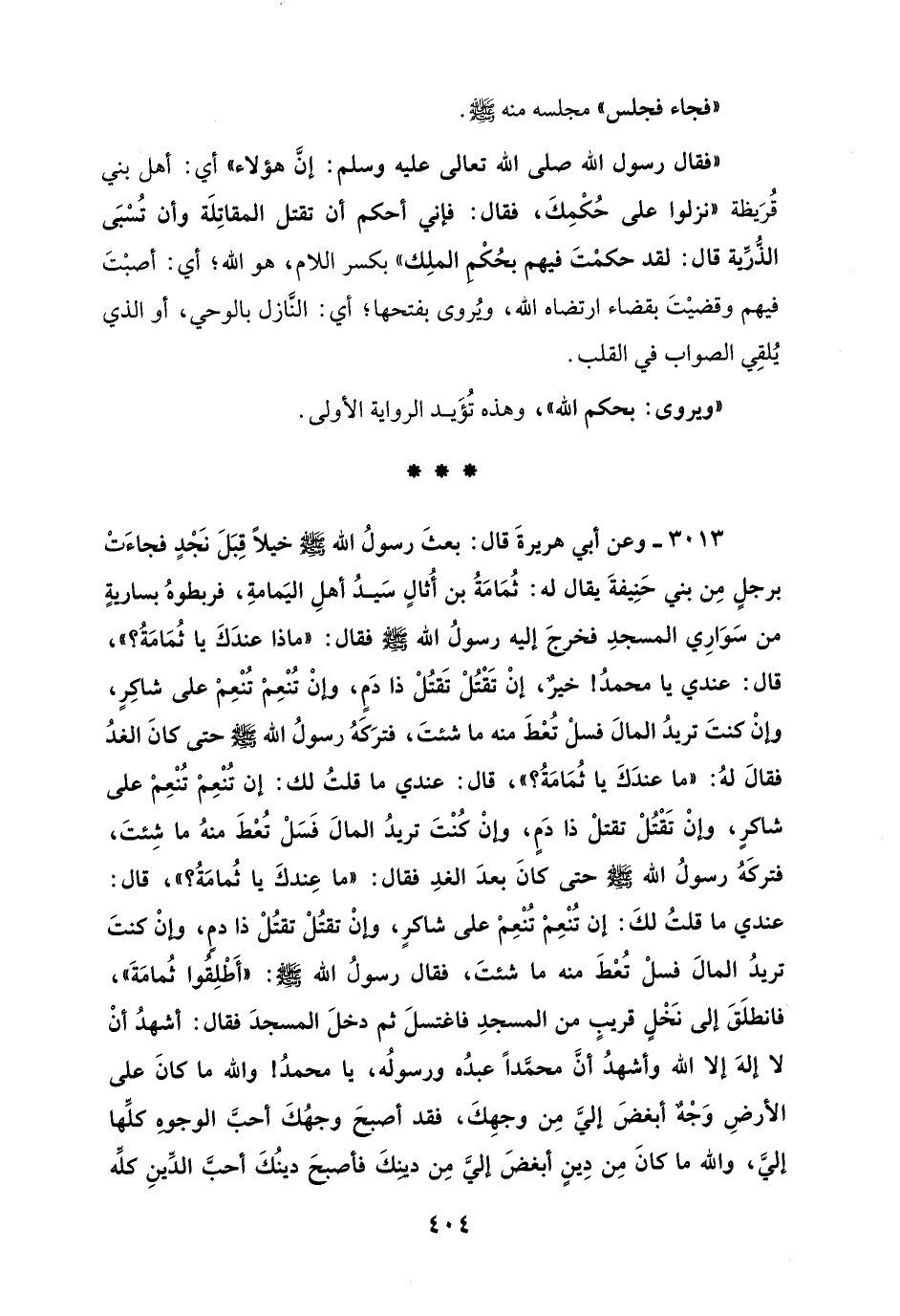3013 - وعن أبي هريرةَ قال: بعثَ رسولُ الله - صلى الله عليه وسلم - خيلاً قِبَلَ نَجْدٍ فجاءَتْ برجلٍ مِن بني حَنِيفةَ يقال له: ثُمَامَةُ بن أُثالٍ سَيدُ أهلِ اليَمامةِ، فربطوهُ بساريةٍ من سَوَارِي المسجدِ فخرجَ إليه رسولُ الله - صلى الله عليه وسلم - فقال: "ماذا عندَكَ يا ثُمَامَةُ؟ "، قال: عندي يا محمدُ! خيرٌ، إنْ تَقْتُلْ تَقتُلْ ذا دَمٍ، وإنْ تُنْعِمْ تُنْعِمْ على شاكِرٍ، وإنْ كنتَ تريدُ المالَ فسلْ تُعْطَ منه ما شئتَ، فترَكَهُ رسولُ الله - صلى الله عليه وسلم - حتى كانَ الغدُ فقالَ لهُ: "ما عندَكَ يا ثُمَامَةُ؟ "، قال: عندي ما قلتُ لك: إن تُنْعِمْ تُنْعِمْ على شاكرٍ، وإنْ تَقْتُلْ تقتلْ ذا دَمٍ، وإنْ كُنْتَ تريدُ المالَ فَسَلْ تُعْطَ منهُ ما شِئتَ، فتركَهُ رسولُ الله - صلى الله عليه وسلم - حتى كانَ بعدَ الغدِ فقال: "ما عِندكَ يا ثُمامَةُ؟ "، قال: عندي ما قلتُ لكَ: إن تُنْعِمْ تُنْعِمْ على شاكرٍ، وإنْ تقتُلْ تقتُلْ ذا دمٍ، وإنْ كنتَ تريدُ المالَ فسلْ تُعْطَ منه ما شئتَ، فقال رسولُ الله - صلى الله عليه وسلم -: "أَطْلِقوا ثُمامَةَ"، فانطلَقَ إلى نخلٍ قريبٍ من المسجدِ فاغتسلَ ثم دخلَ المسجدَ فقال: أشهدُ أن لا إلهَ إلا الله وأشهدُ أن محمَّداً عبدُه ورسولُه، يا محمدُ! والله ما كانَ على الأرضِ وَجْهٌ أبغضَ إليَّ مِن وجهِكَ، فقد أصبحَ وجهُكَ أحبَّ الوجوهِ كلِّها إليَّ، والله ما كانَ مِن دِينٍ أبغضَ إليَّ مِن دينِكَ فأصبحَ دينُكَ أحبَّ الدِّينِ كلِّه