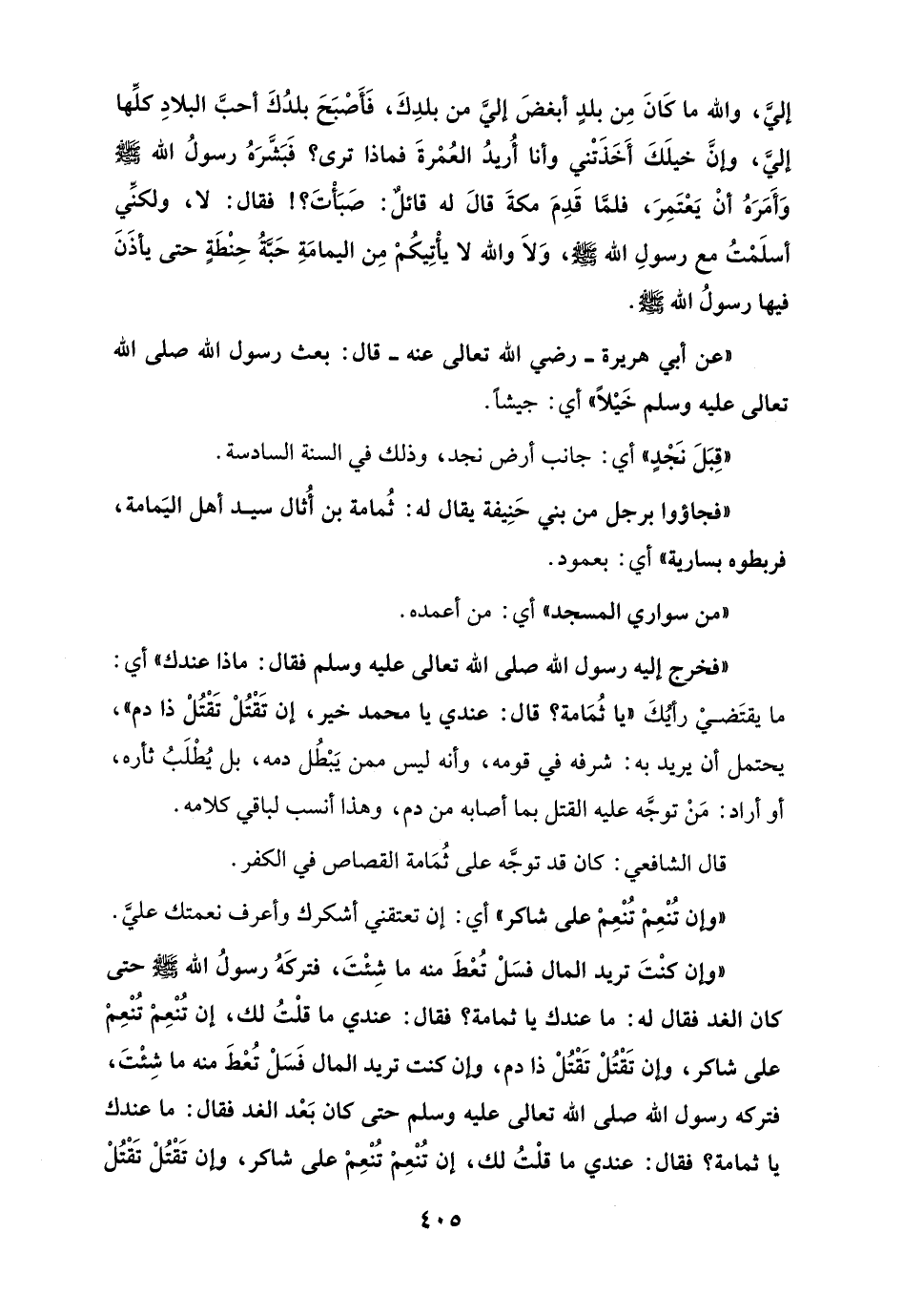 "وإن كنْتَ تريد المال فسَلْ تُعْطَ منه ما شِئْتَ، فتركَهُ رسولُ الله - صلى الله عليه وسلم - حتى كان الغد فقال له: ما عندك يا ثمامة؟ فقال: عندي ما قلْتُ لك، إن تُنْعِمْ تُنْعِمْ على شاكر، وإن تَقْتُلْ تَقْتُلْ ذا دم، وإن كنت تريد المال فَسَلْ تُعْطَ منه ما شِئْتَ، فتركه رسول الله صلى الله تعالى عليه وسلم حتى كان بَعْد الغد فقال: ما عندك يا ثمامة؟ فقال: عندي ما قلْتُ لك، إن تُنْعِمْ تُنْعِمْ على شاكر، وإن تَقْتُلْ تَقْتُلْ