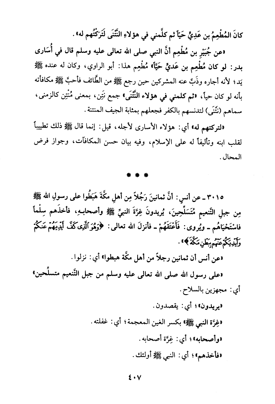 3015 - عن أنسٍ: أنَّ ثمانينَ رَجُلاً مِن أهلِ مكَّةَ هَبَطُوا على رسولِ الله - صلى الله عليه وسلم - مِن جبلِ التَّنعيم مُتَسَلِّحِينَ، يُريدونَ غِرَّةَ النبيِّ - صلى الله عليه وسلم - وأصحابهِ، فأخذَهم سِلْماً فاستَحْيَاهُم - ويُروى: فَأَعْتَقَهُمْ - فأنزلَ الله تعالى: {وَهُوَ الَّذِي كَفَّ أَيْدِيَهُمْ عَنْكُمْ وَأَيْدِيَكُمْ عَنْهُمْ بِبَطْنِ مَكَّةَ} ".
