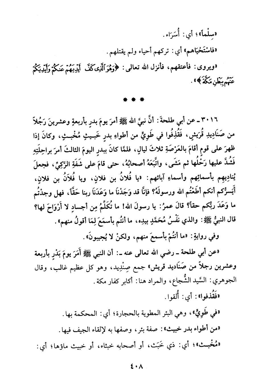 3016 - عن أبي طلحةَ: أن نبيَّ الله - صلى الله عليه وسلم - أمرَ يومَ بدرٍ بأربعةٍ وعشرينَ رَجُلاً من صَنَادِيدِ قُرَيشٍ، فَقُذِفُوا في طَوِيٍّ من أطواءِ بدرٍ خَبيثٍ مُخْبثٍ، وكانَ إذا ظهرَ على قومٍ أقامَ بالعَرْصَةِ ثلاثَ ليالٍ، فلمَّا كانَ ببدرٍ اليومَ الثالثَ أمرَ براحِلَتِهِ فَشُدَّ عليها رَحْلُها ثم مَشَى، واتَّبَعَهُ أصحابُهُ، حتى قامَ على شَفَةِ الرَّكِيِّ، فجعلَ يُنادِيهِم بأسمائِهم وأسماءِ آبائهم: "يا فُلانُ بن فلانٍ، ويا فُلاَنُ بن فلانٍ، أَيَسرُّكم أنكم أطَعْتُم الله ورسولَهُ؟ فإنَّا قد وَجَدْنَا ما وَعَدَنَا ربنا حَقًّا، فهل وجدْتُم ما وَعَدَ ربُّكم حقاً؟ قالَ عمرُ: يا رسولَ الله! ما تُكَلِّمُ مِن أجسادٍ لا أَرْوَاحَ لها؟ قال النبيُّ - صلى الله عليه وسلم -: والذي نَفْسُ مُحَمَّدٍ بيدِه، ما أنتُم بأسمَعَ لِمَا أقولُ منهم".