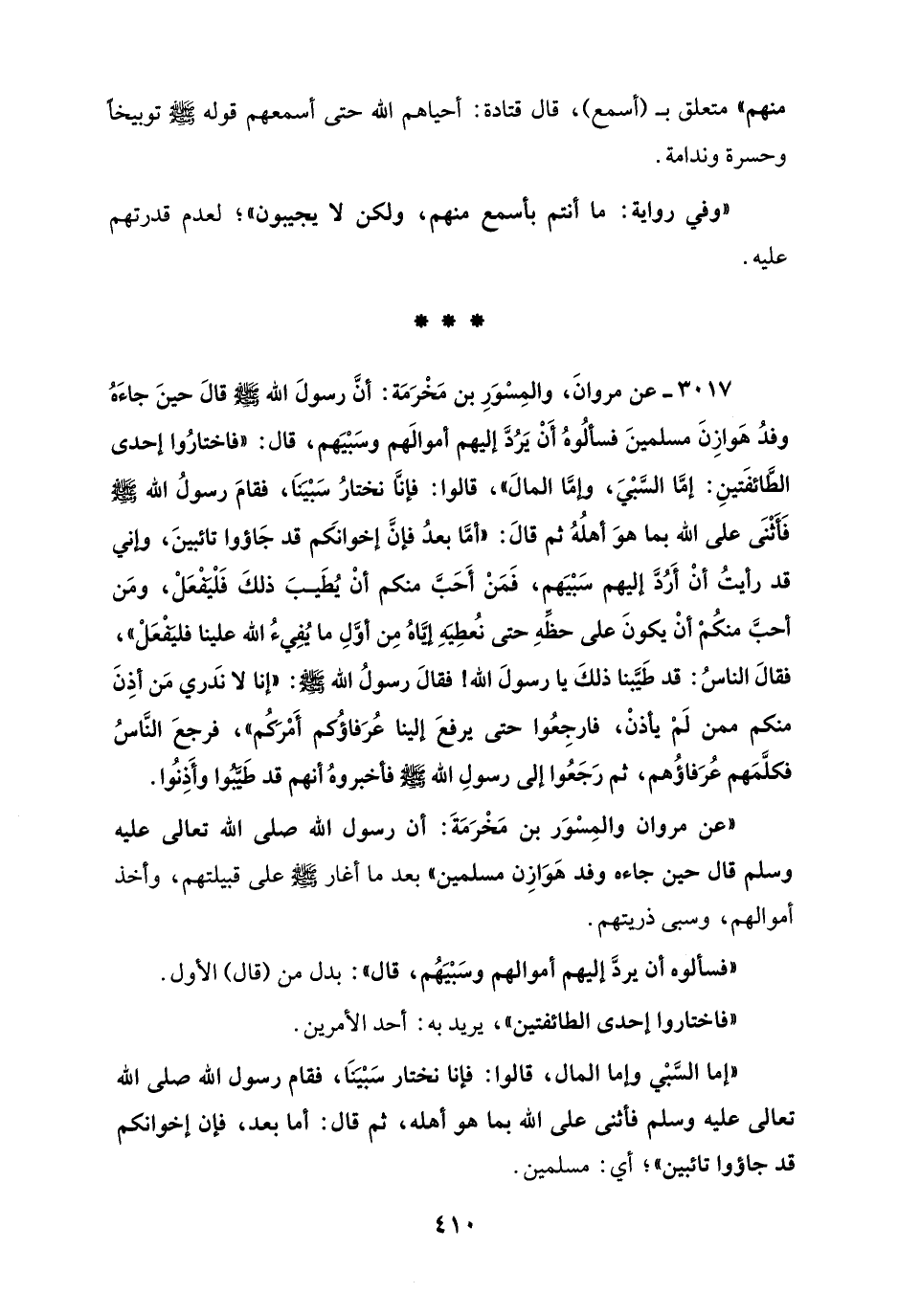 3017 - عن مروانَ، والمِسْوَرِ بن مَخْرَمَة: أنَّ رسولَ الله - صلى الله عليه وسلم - قالَ حينَ جاءَهُ وفدُ هَوازِنَ مسلمينَ فسألُوهُ أَنْ يَرُدَّ إليهم أموالَهم وسَبْيَهم، قال: "فاختارُوا إحدى الطَّائفَتينِ: إمَّا السَّبْيَ، وإمَّا المالَ"، قالوا: فإنَّا نختارُ سَبْيَنَا، فقامَ رسولُ الله - صلى الله عليه وسلم - فَأَثْنَى على الله بما هوَ أهلُهُ ثم قالَ: "أمَّا بعدُ فإنَّ إخوانَكم قد جَاؤوا تائبينَ، وإني قد رأيتُ أنْ أَرُدَّ إليهم سَبْيَهم، فَمَنْ أَحَبَّ منكم أنْ يُطَيبَ ذلكَ فَلْيَفْعَلْ، ومَن أحبَّ منكُمْ أنْ يكونَ على حظِّهِ حتى نُعطِيَهِ إيَّاهُ مِن أوَّلِ ما يُفِيءُ الله علينا فليَفْعَلْ"، فقالَ الناسُ: قد طَيَّبنا ذلكَ يا رسولَ الله! فقالَ رسولُ الله - صلى الله عليه وسلم -: "إنا لا نَدري مَن أذِنَ منكم ممن لَمْ يأذنْ، فارجِعُوا حتى يرفعَ إلينا عُرَفاؤُكم أَمْرَكُم"، فرجعَ النَّاسُ فكلَّمَهم عُرَفاؤُهم، ثم رَجَعُوا إلى رسولِ الله - صلى الله عليه وسلم - فأخبروهُ أنهم قد طَيَّبُوا وأَذِنُوا.