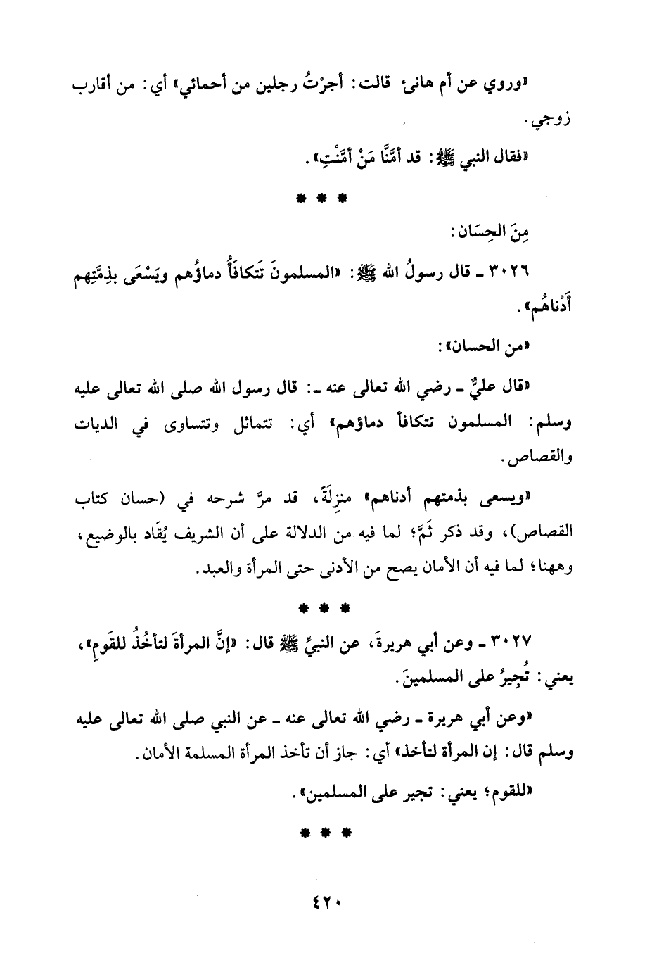 3027 - وعن أبي هريرةَ، عن النبيِّ - صلى الله عليه وسلم - قال: "إنَّ المرأةَ لتأخُذُ للقَومِ"، يعني: تُجيرُ على المسلمينَ.