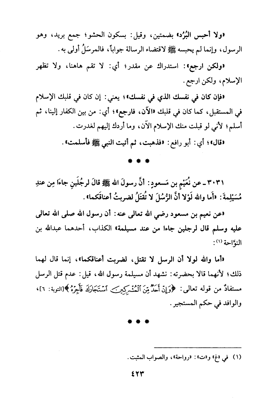 "أما والله لولا أن الرسل لا تقتل، لضربت أعناقكما"، إنما قال لهما ذلك؛ لأنهما قالا بحضرته: نشهد أن مسيلمة رسول الله، قيل: عدم قتل الرسل مستفادٌ من قوله تعالى: {وَإِنْ أَحَدٌ مِنَ الْمُشْرِكِينَ اسْتَجَارَكَ فَأَجِرْهُ} [التوبة: 6]، والوافد في حكم المستجير.