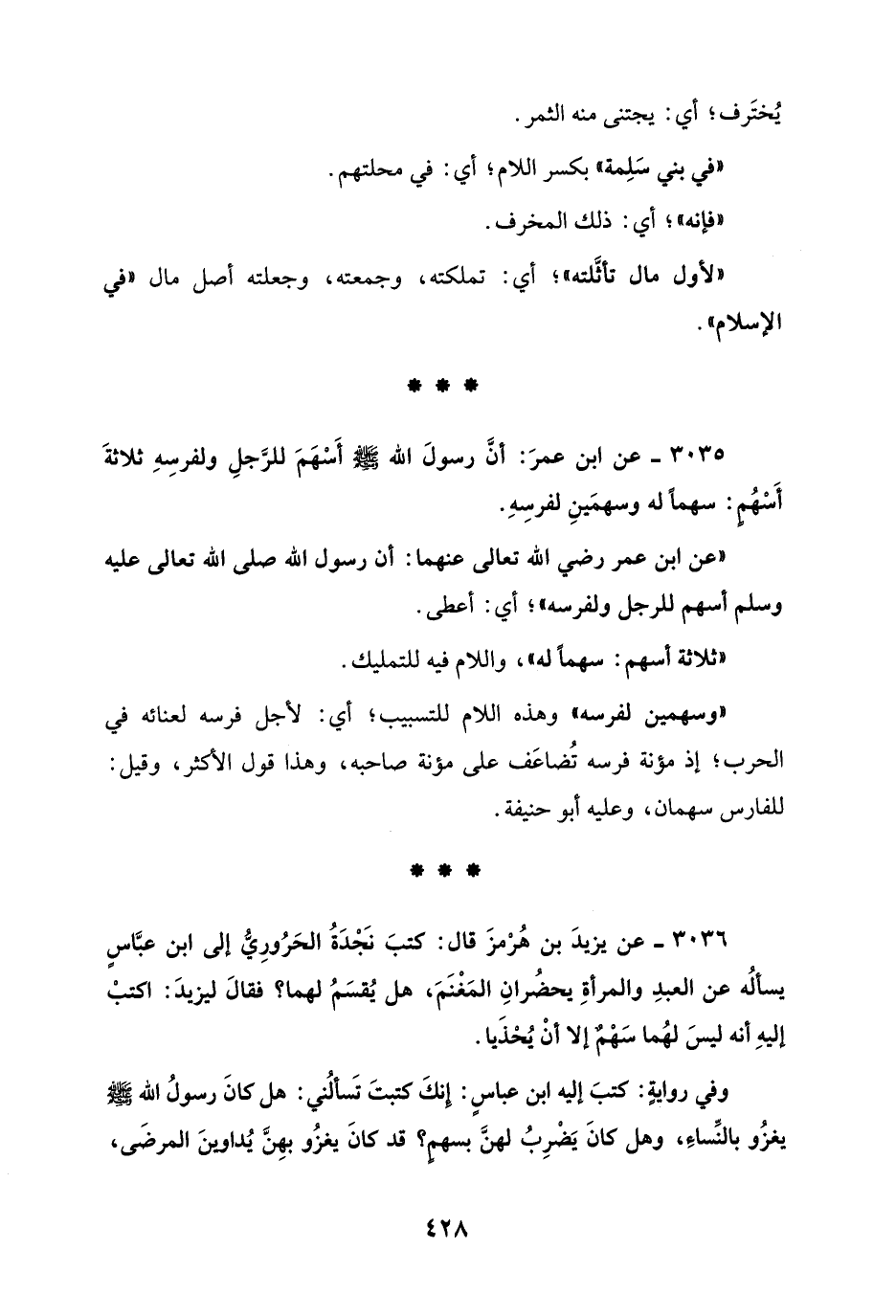 3035 - عن ابن عمرَ: أن رسولَ الله - صلى الله عليه وسلم - أَسْهَمَ للرَّجلِ ولفرسِهِ ثلاثةَ أَسْهُم: سهمًا له وسهمَينِ لفرسِهِ.