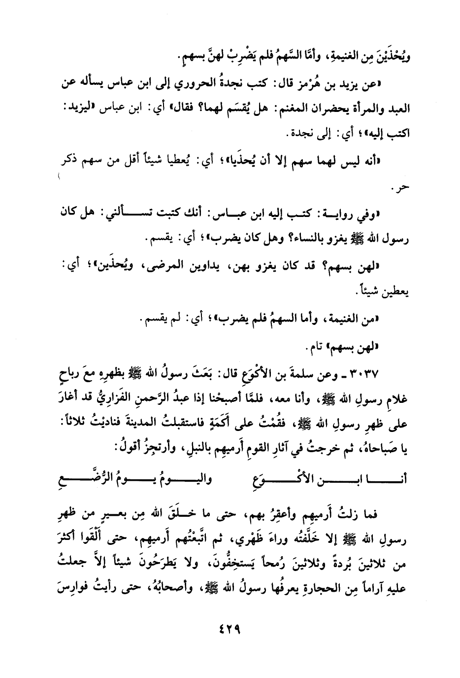 3037 - وعن سلمةَ بن الأكْوَعِ قال: بَعَثَ رسولُ الله - صلى الله عليه وسلم - بظهرِهِ معَ رباحٍ كلامِ رسولِ الله - صلى الله عليه وسلم -، وأنا معه، فلمَّا أصبحْنا إذا عبدُ الرَّحمنِ الفَزارِيُّ قد أغارَ على ظهرِ رسولِ الله - عز وجل -، فقُمْتُ على أكَمَةٍ فاستقبلتُ المدينةَ فناديْتُ ثلاثًا: يا صَباحاهُ، ثم خرجتُ في آثارِ القومِ أَرميهِم بالنبلِ، وأرتجزُ أقولُ:
