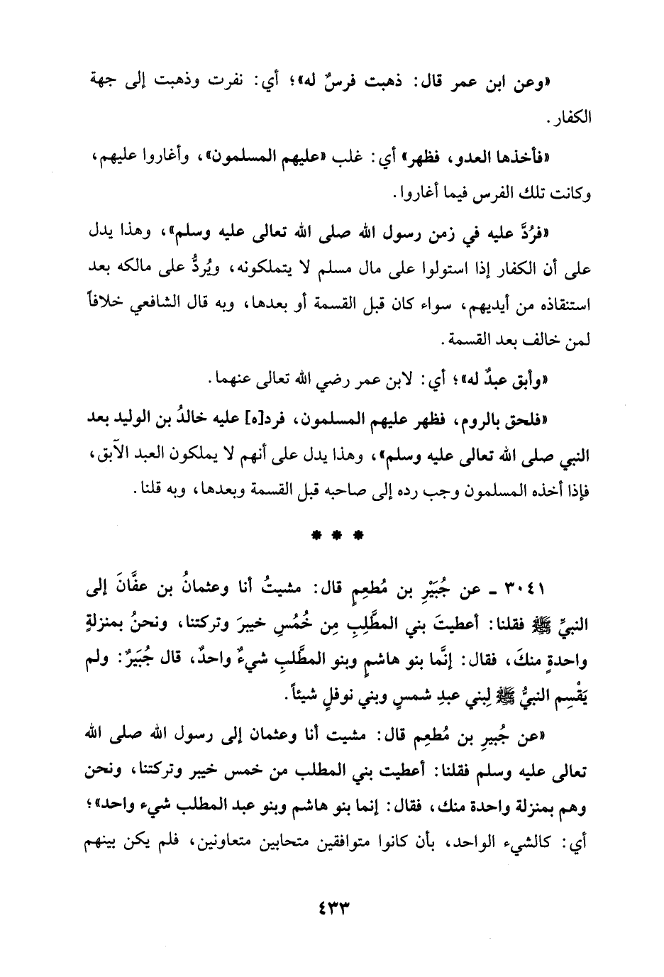"فرُدَّ عليه في زمن رسول الله - صلى الله تعالى عليه وسلم - "، وهذا يدل على أن الكفار إذا استولوا على مال مسلم لا يتملكونه، ويُردُّ على مالكه بعد استنقاذه من أيديهم، سواء كان قبل القسمة أو بعدها، وبه قال الشافعي خلافًا لمن خالف بعد القسمة.