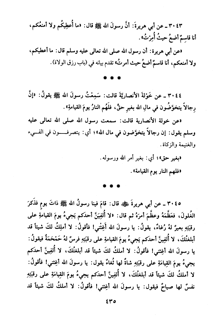3045 - عن أبي هريرةَ - رضي الله عنه - قال: قامَ فينا رسولُ الله - صلى الله عليه وسلم - ذاتَ يومٍ فذَكرَ الغُلولَ، فعَظَّمَهُ وعظَّمَ أمرَهُ ثم قال: "لا أُلفِيَنَّ أحدكم يَجيءُ يومَ القيامةِ على رقبَتِهِ بعيرٌ لهُ رُغاءٌ، يقولُ: يا رسولَ الله أَغِثْني! فأقولُ: لا أملِكُ لكَ شيئًا قد أبلغتُكَ، لا أُلفِينَّ أحدَكم يَجيءُ يومَ القيامةِ على رقبَتِهِ فرسٌ لهُ حَمْحَمَةٌ فيقولُ: يا رسولَ الله أغِثني! فأقولُ: لا أملكُ لكَ شيئًا قد أبلغتُكَ، لا أُلفِينَّ أحدكم يجيءُ يومَ القِيامَةِ على رقبَتِهِ شاةٌ لها ثُغاءٌ يقول: يا رسولَ الله أغِثني! فأقولُ: لا أملكُ لكَ شيئًا قد أبلغتُكَ، لا أُلفِينَّ أحدَكم يجيءُ يومَ القِيامَةِ على رقبَتِهِ نفسٌ لها صياحٌ فيقول: يا رسولَ الله أغِثني! فأقولُ: لا أملكُ لكَ شيئًا قد