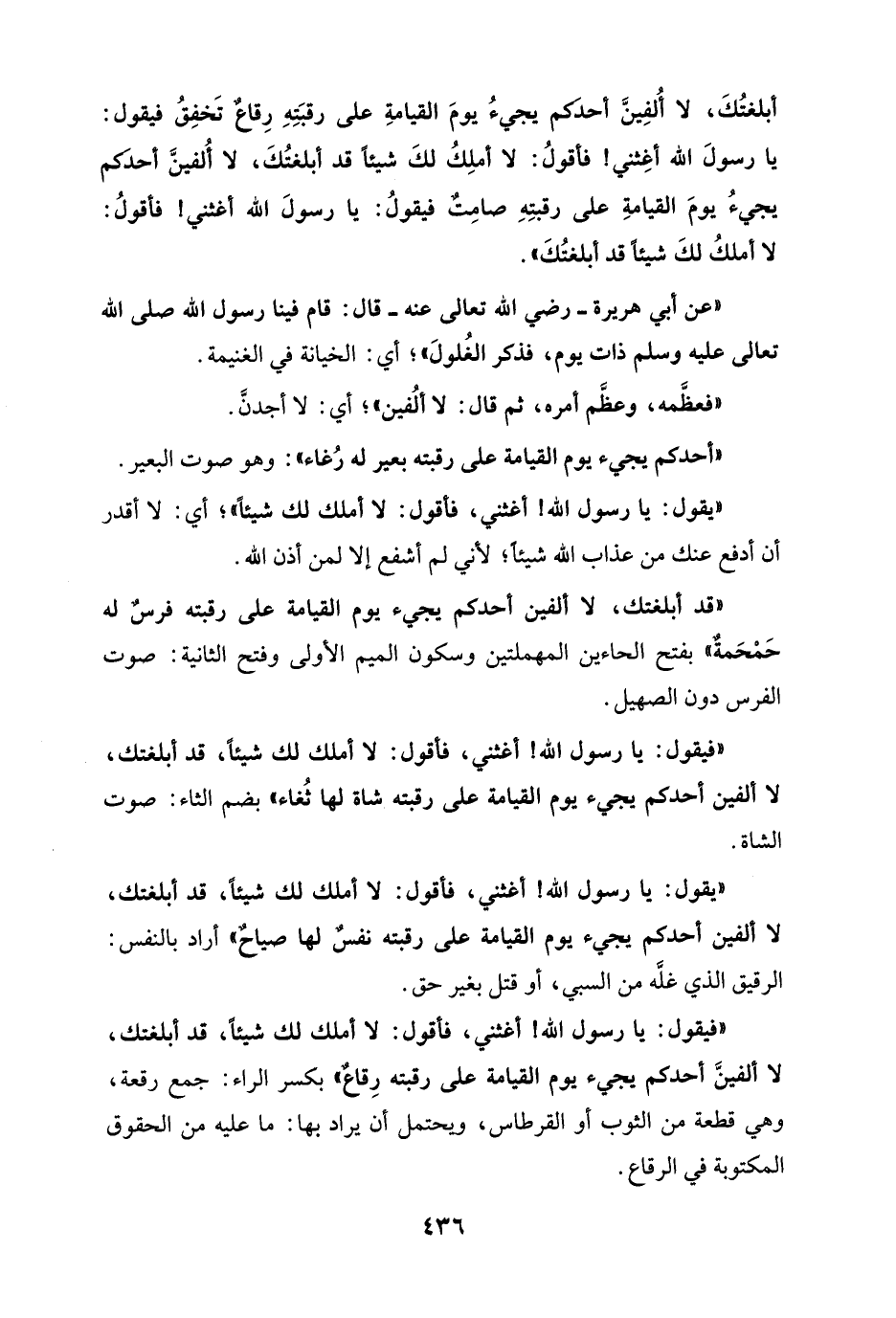 "فيقول: يا رسول الله! أغثني، فأقول: لا أملك لك شيئاً، قد أبلغتك، لا ألفين أحدكم يجيء يوم القيامة على رقبته شاة لها ثُغاء" بضم الثاء: صوت الشاة.
